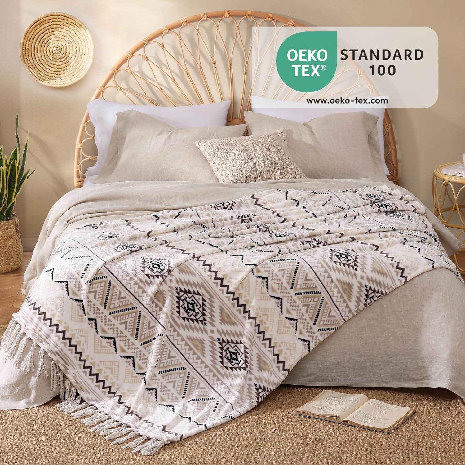 CASAAGUSTO Boho Throw Blanket - Beige and Gray Decorative Blankets with Tassel, Printed Flannel Bohemian Blanket for Chair, Bed, Sofa, Couch(50 * 60, Beige and Gray)