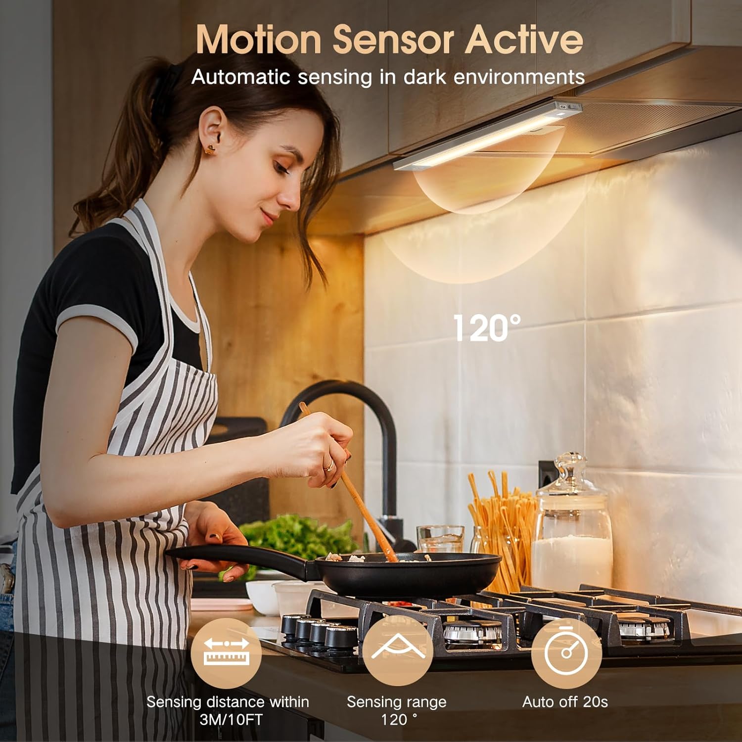 - [New Motion Sensor & long-Lasting Use]: The latest flat sensor design extends the life of the motion sensor light, it can sense and light up within 10ft and 120Β° of the lamp. With 1800mAh rechargeable battery inside, after fully charging, this kitchen cabinet lights last up to 3-5 hours under ON mode and almost 1 month under NIGHT mode. No more Extra AA/AAA Battery. Energy Save & Save More Money!
