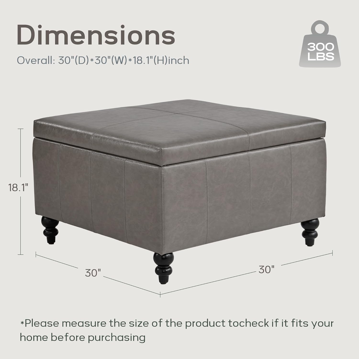 - LARGE CAPACITY: The large square storage ottoman bench measures 30" D * 30" W * 18" H. The large capacity ottoman can be used as blanket storage, foot stool, toy chest, and other items. It can also be used as a ottoman coffee table to provide more convenient space for your living room