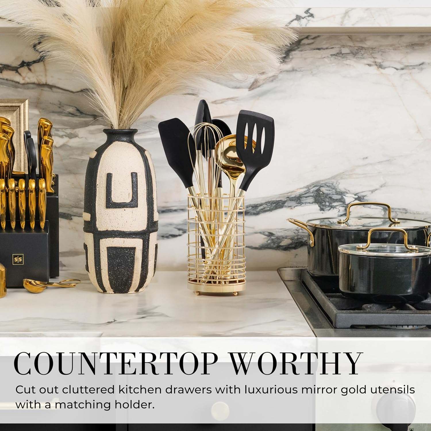 - BUILT TO LAST (AND TO IMPRESS) โ No more scratched pans or melting tools! Our durable gold kitchen utensils are designed to be gentle on nonstick surfaces while standing up to high heat. This black and gold utensil set protects your cookware and makes every meal a masterpiece. And with a sleek matching holder, your countertops will be more organized (and glamorous) than ever. Get ready to show off your new black and gold utensils!