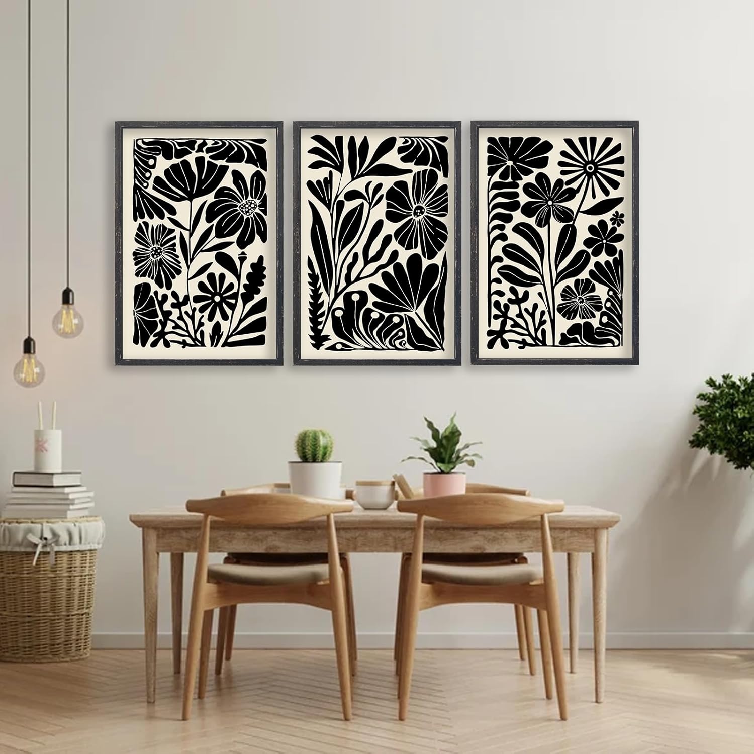 Abstract Floral Botanical Wall Art 16x24 Inch 3 Piece Black Vintage Boho Plant Flower Minimalist Wood Frame Sign Home Living Room Family Office Mid Century Print Wall Hanging Decor (Black)