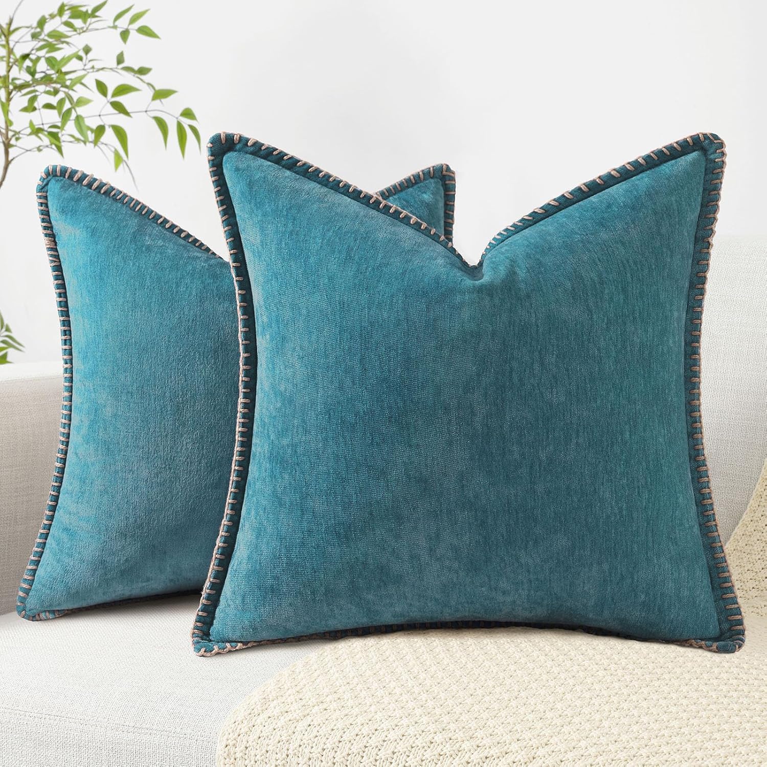 decorUhome Chenille Soft Throw Pillow Covers 24x24 Set of 2, Farmhouse Velvet Neutral Decorative Euro Pillow Covers with Stitched Edge for Couch Sofa Bed Home Decor, Teal
