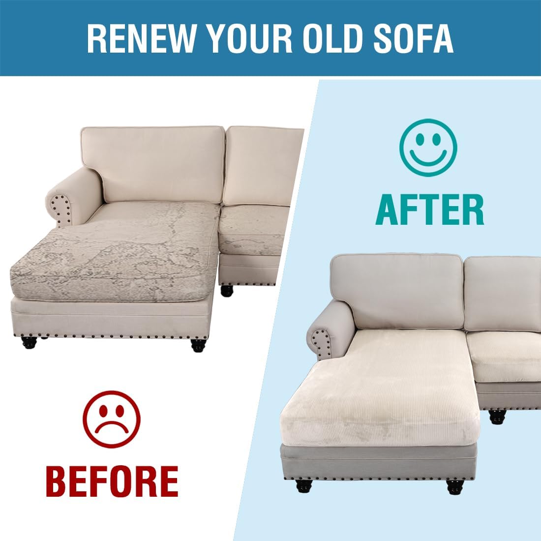 - INCREDIBLY COMFORTABLE VELVET: Products passed GLOBAL RECYCLED STANDARD certificate.This innovated stretch sofa slipcovers are constructed with 4 PIECES,including 1 Chaise cover and 3 individual cushion covers. Crafted from luxurious velvet plush fabric with unique striped cuts, feature thick, soft, smooth, anti-wrinkle, no fading, durable as well as highly stretch. Protect your cushion furniture from daily wears and tears, stains, kids, scratches from pet claws, dogs or accidental spills