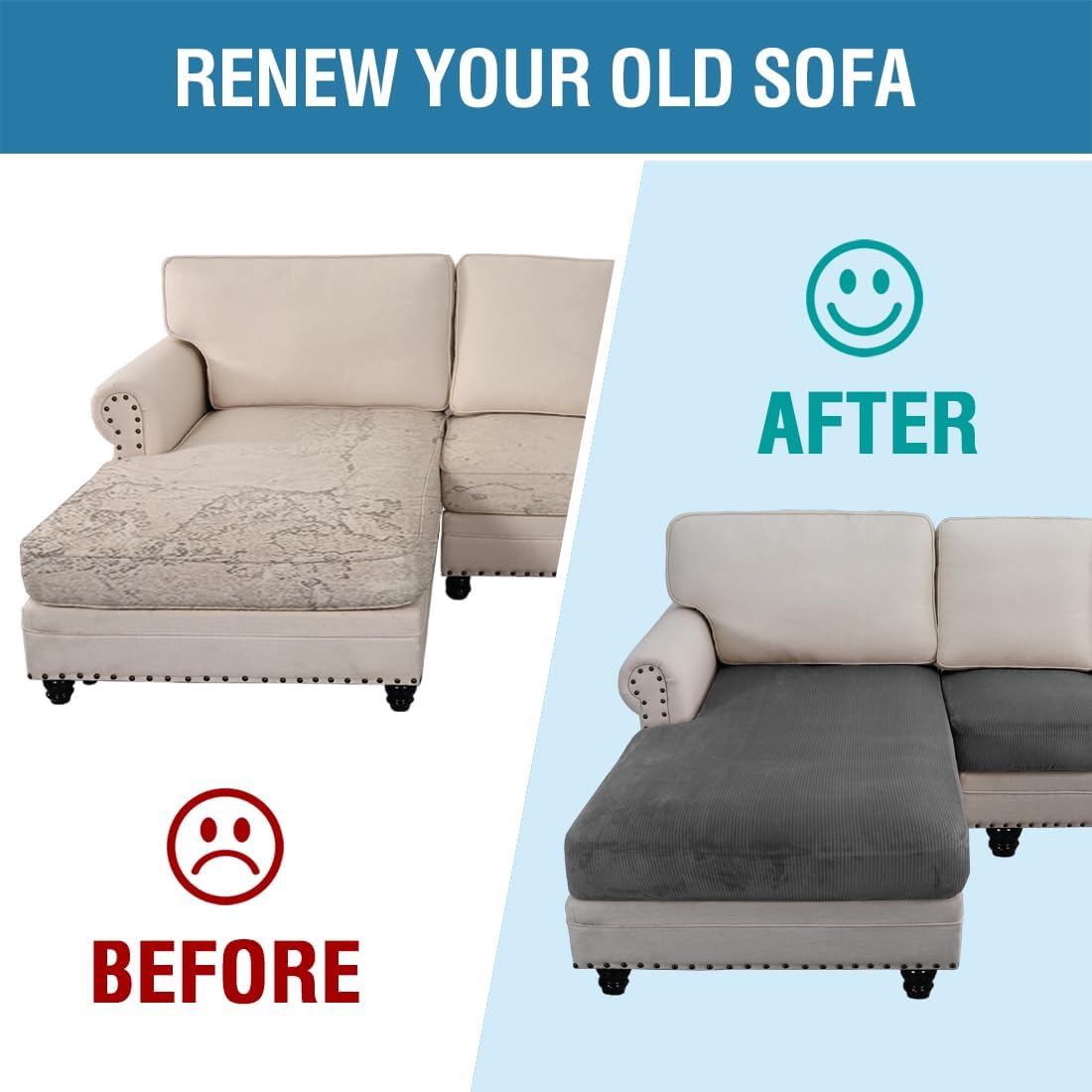 - INCREDIBLY COMFORTABLE VELVET: Products passed GLOBAL RECYCLED STANDARD certificate.This innovated stretch sofa slipcovers are constructed with 4 PIECES,including 1 Chaise cover and 3 individual cushion covers. Crafted from luxurious velvet plush fabric with unique striped cuts, feature thick, soft, smooth, anti-wrinkle, no fading, durable as well as highly stretch. Protect your cushion furniture from daily wears and tears, stains, kids, scratches from pet claws, dogs or accidental spills