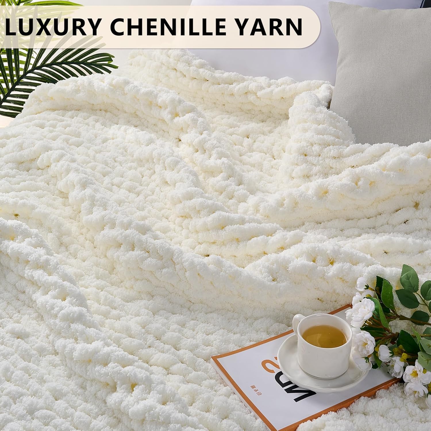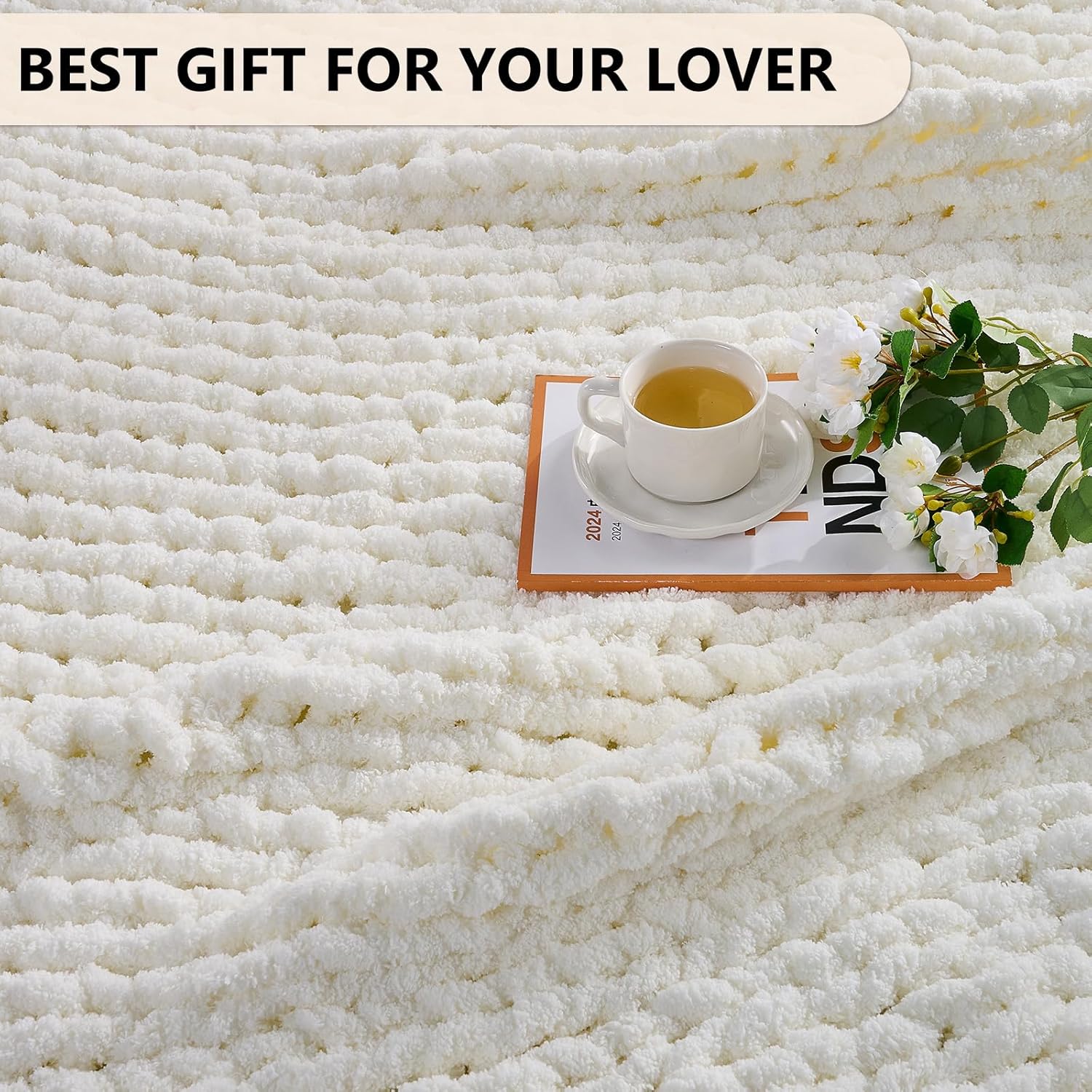 L'AGRATY Chunky Knit Blanket Throw: Soft Chenille Yarn Throw Blanket 60x80 - Handmade Thick Cable Crochet Blanket - Large Chunky Rope Throw Blanket for Couch Sofa Bed Home Decor(Cream White)