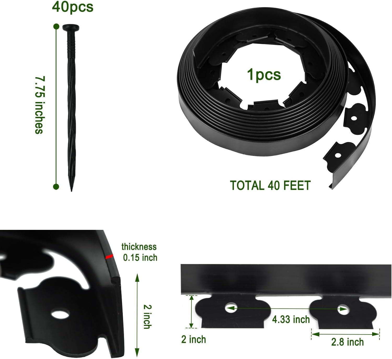 - Package Included: Lawn edging border offers 40 ft length landscape edging of 2 inches tall and 40 pcs (7.75 inches high) of upgraded plastic landscape stakes which are stronger, will not break easily