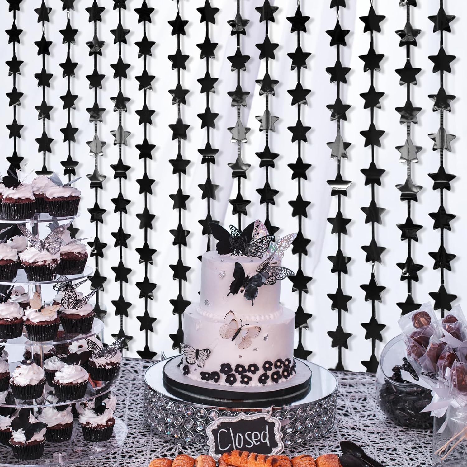 - π€γ IT'S TIME TO CELEBRATE! γ: Our 2 pack Black Stars foil fringe curtains, Large size (width x drop) 3.3 x 6.6 ft each, perfect photo backdrop for various parties.