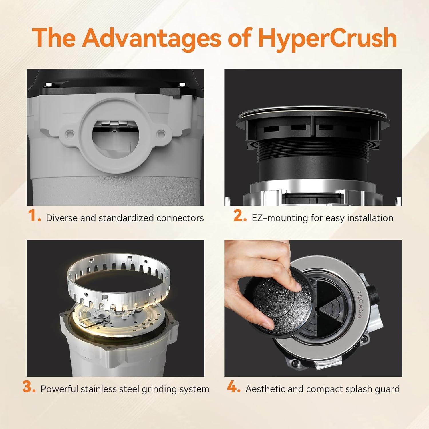 Garbage Disposal, TECASA 1/2 HP Pro Food Waste Coutinuous Feed, Garbage Disposals with Stopper Power Cord, Stainless Steel Grinding System for Kitchen Sink - HyperCrush 50 PRO
