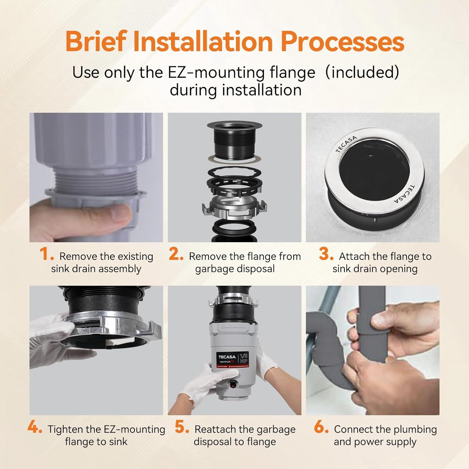 - 𝟏/𝟐 𝐇𝐏: The TECASA 1/2 HP garbage disposal is ideal for most home kitchens, fitting standard 3-1/2 inch sink openings. It comes with a pre-installed 39" power cord for quick and easy electrical connection. The compact, space-saving design features a DC motor that delivers instant, enhanced torque for efficient grinding operations.