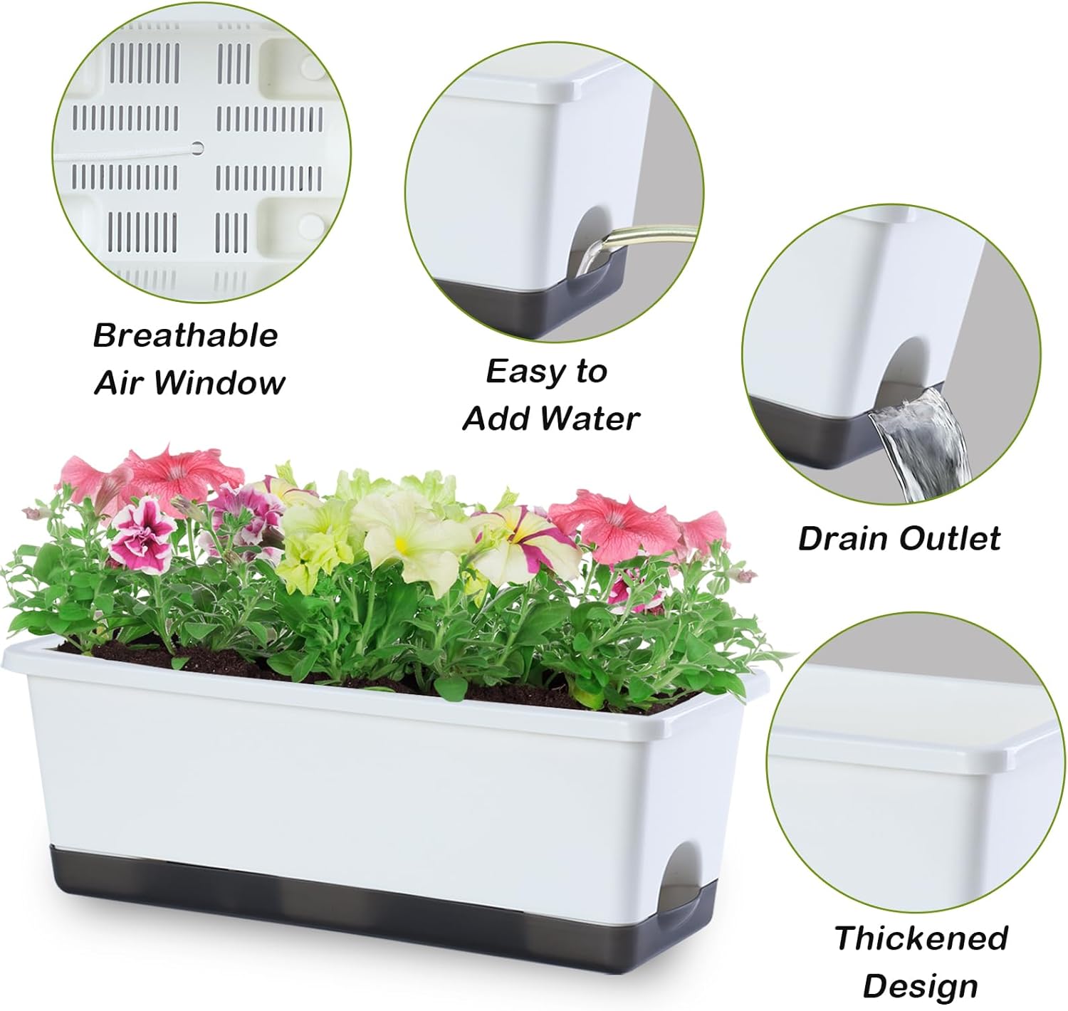 - 【Premium & Durable】The planter pots are made of high quality PP material and has been thickened to bear up to 150KG (330LB). This window box planter is sturdy, wear-resistant and durable. It can be exposed to light, wind, and sunlight for long periods of time, with a lifespan of decades. It is an excellent planter box for both indoor and outdoor.