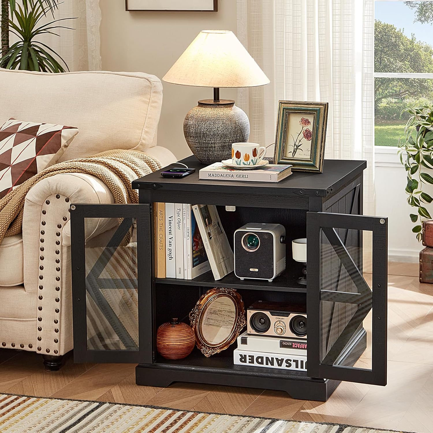 - 🏡[Farmhouse-Style end Table with Charging Station]This large end tables with generous storage is a perfect fusion of farmhouse and industrial metal styles. The exquisite barn-style tempered glass doors and the black metal corner accents add an elegant touch to the cabinet body, making it visually captivating from any angle.