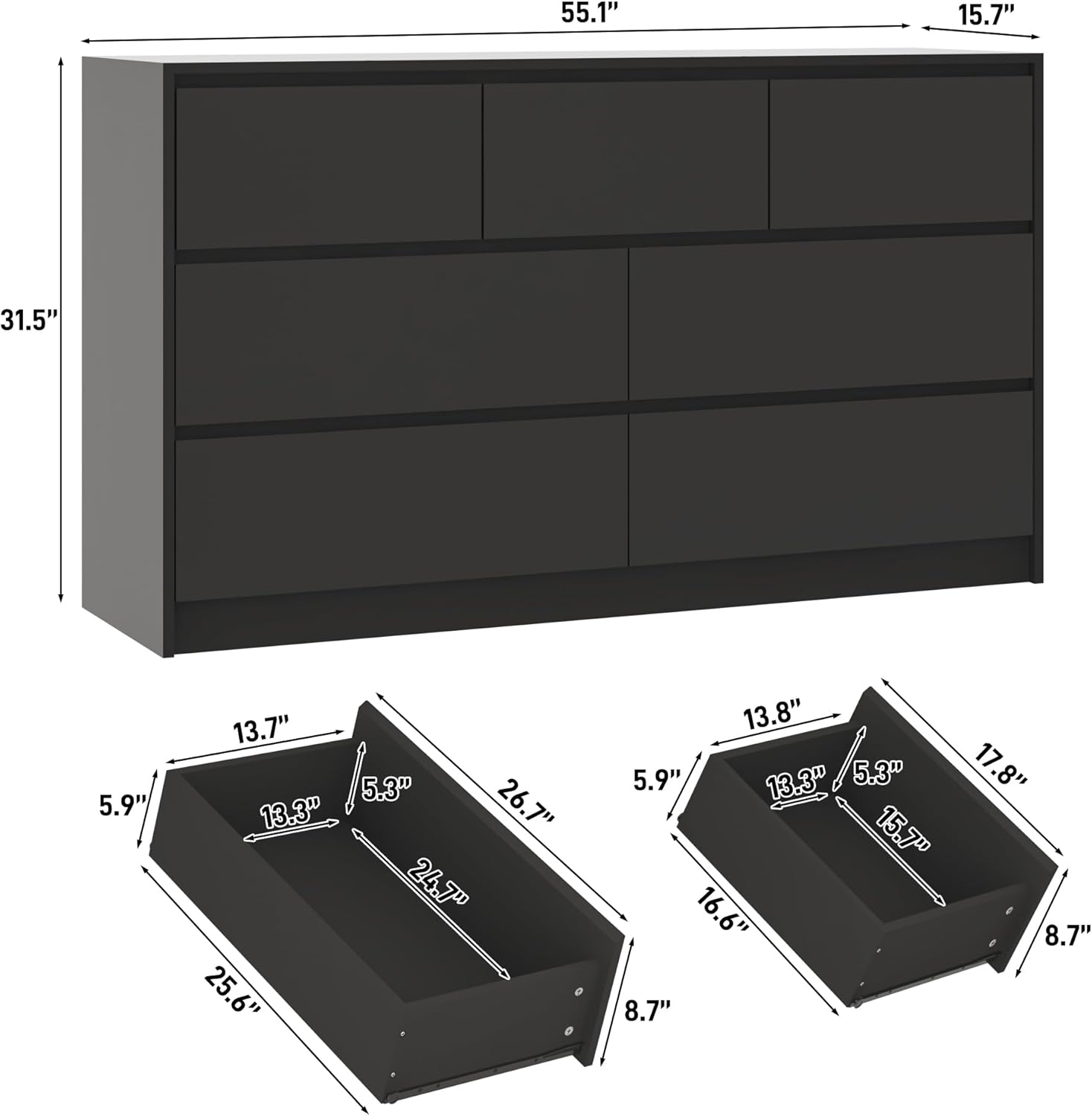 - 【Spacious interior】Overall size:55.1"D x 15.7"W x 31.5"H. Drawers dimensions: 26.8"D x 14" W x 8.7"H and 17.8"D x 14" W x 8.7"H. With 4 large drawers and 3 medium drawers with a depth of 5.9 inches, it is easy to organize your things and keep the room clean and tidy. The roomy top for placing your favorite picture frames, flowers and cute decorations
