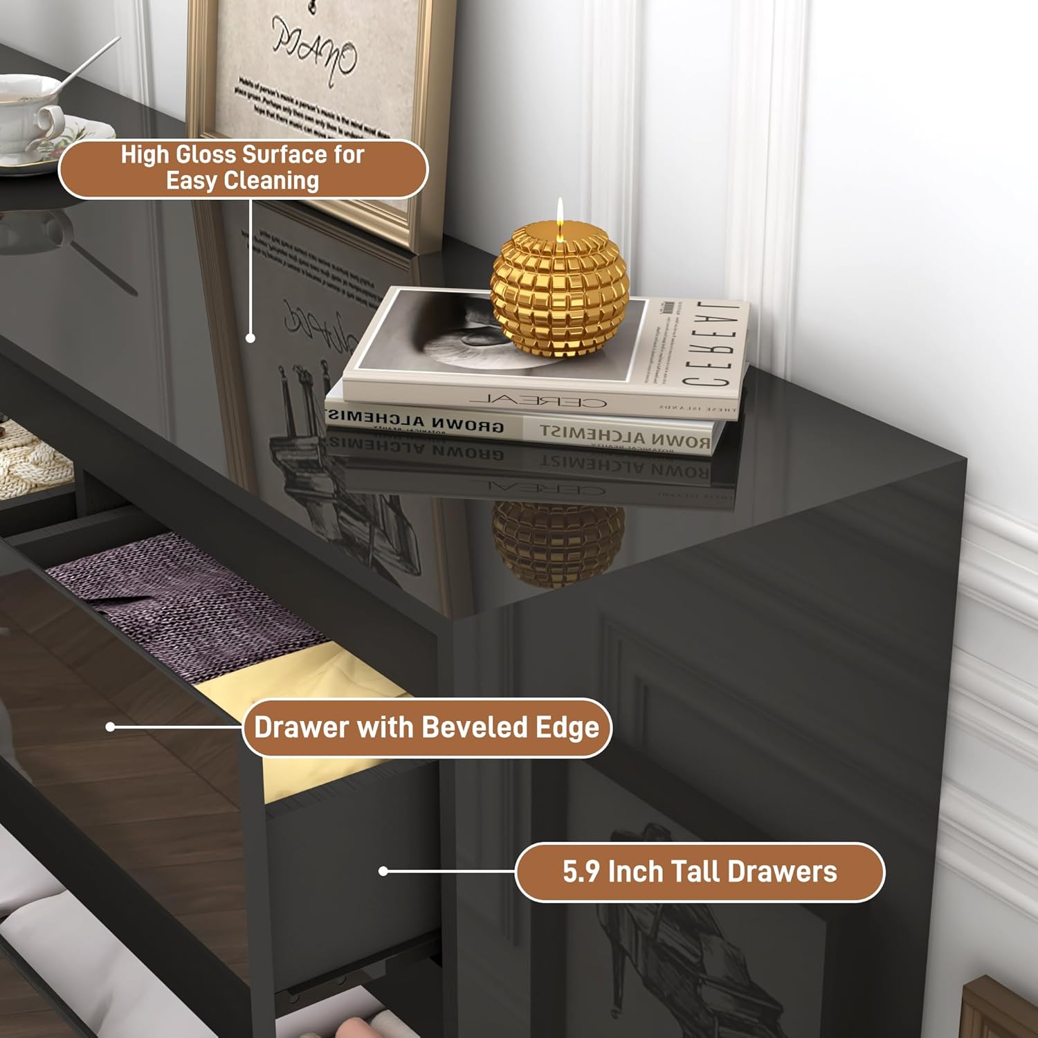 - 【Thick and sturdy】This black modern high gloss dresser is mainly composed of medium-density fiberboard material, which is stable. The retracted bottom base is waterproof and scratch-resistant, metal drawer slides for long-term use. Easy maintenance with just a damp cloth