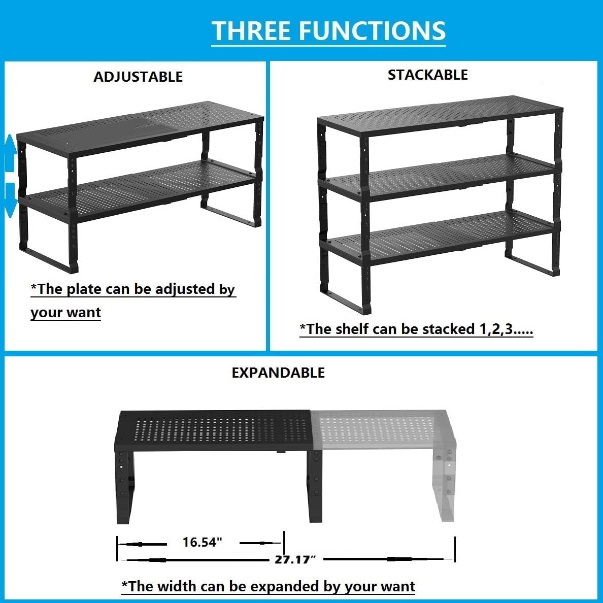- ⭐【Flexible retractable design (Expandable & Adjustable)】This kitchen shelf uses a retractable design, which can be freely adjusted according to the size of the kitchen space and personal needs. Whether it is a narrow corner or a spacious storage room, it can be easily adapted to make the most of every inch of space.(10.1"D x 16.54"W~26.38"W x 6.22"H)