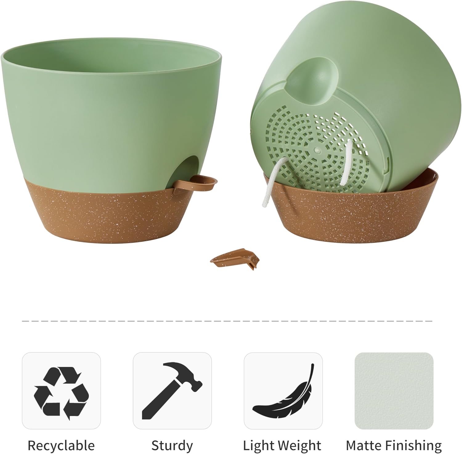 FaithLand 3-Pack Large Planter Pots, 12 10 9 Inch Self Watering Flower Pots for Indoor Outdoor Garden Plants, Green with Brown