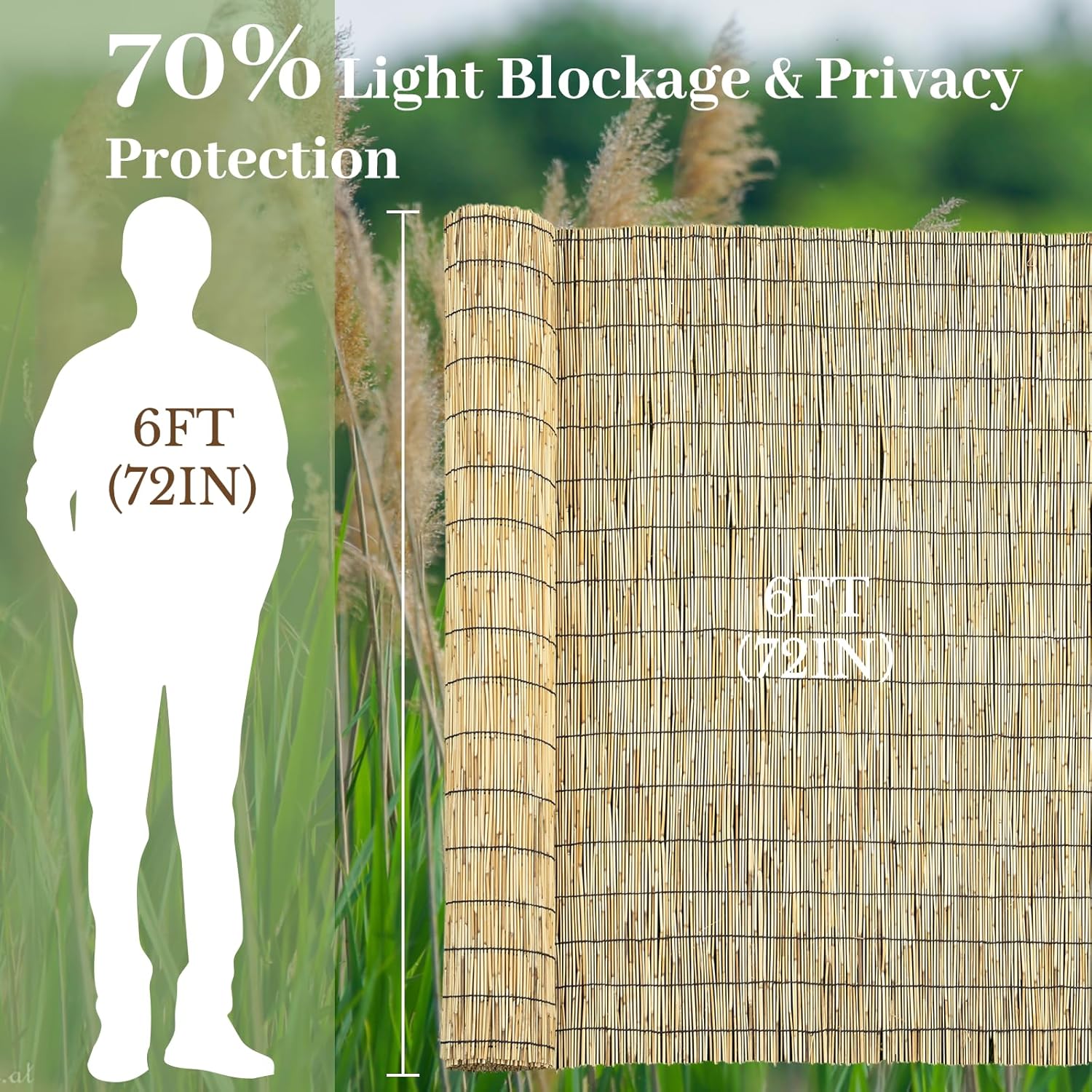 - Product Features: The bamboo reed fence rolls are 6 feet high and unfold to a length of 16.4 feet. They are designed to conceal unsightly bins, fences, or other objects, while also enhancing privacy for backyards, balconies, patios, or swimming pools