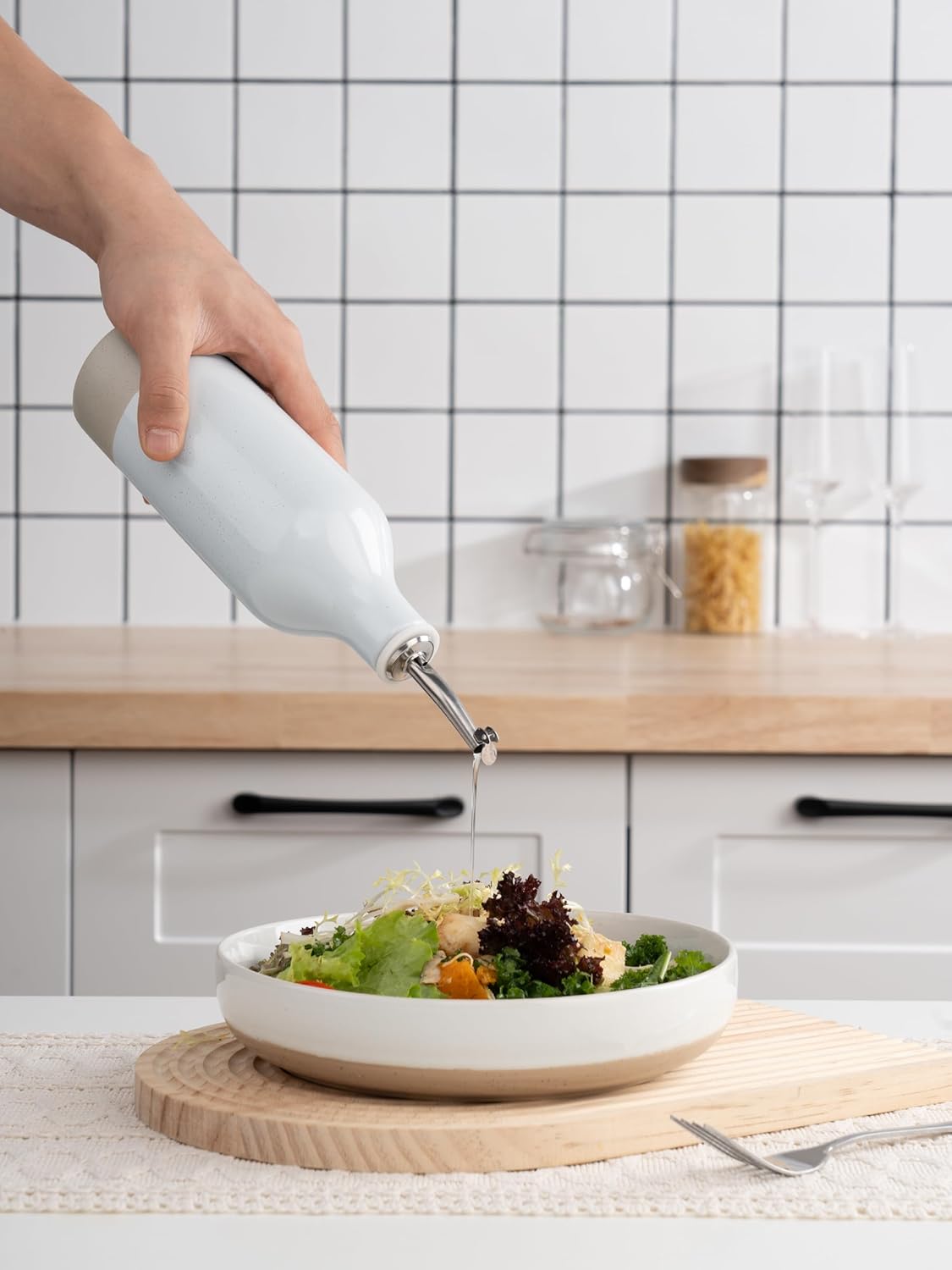 - KEEPS OIL FRESH - Exposure to light can cause olive oil to go rancid. This opaque olive oil dispenser bottle ceramic protects your olive oil or vinegar from harmful UV rays, keeping it fresh longer