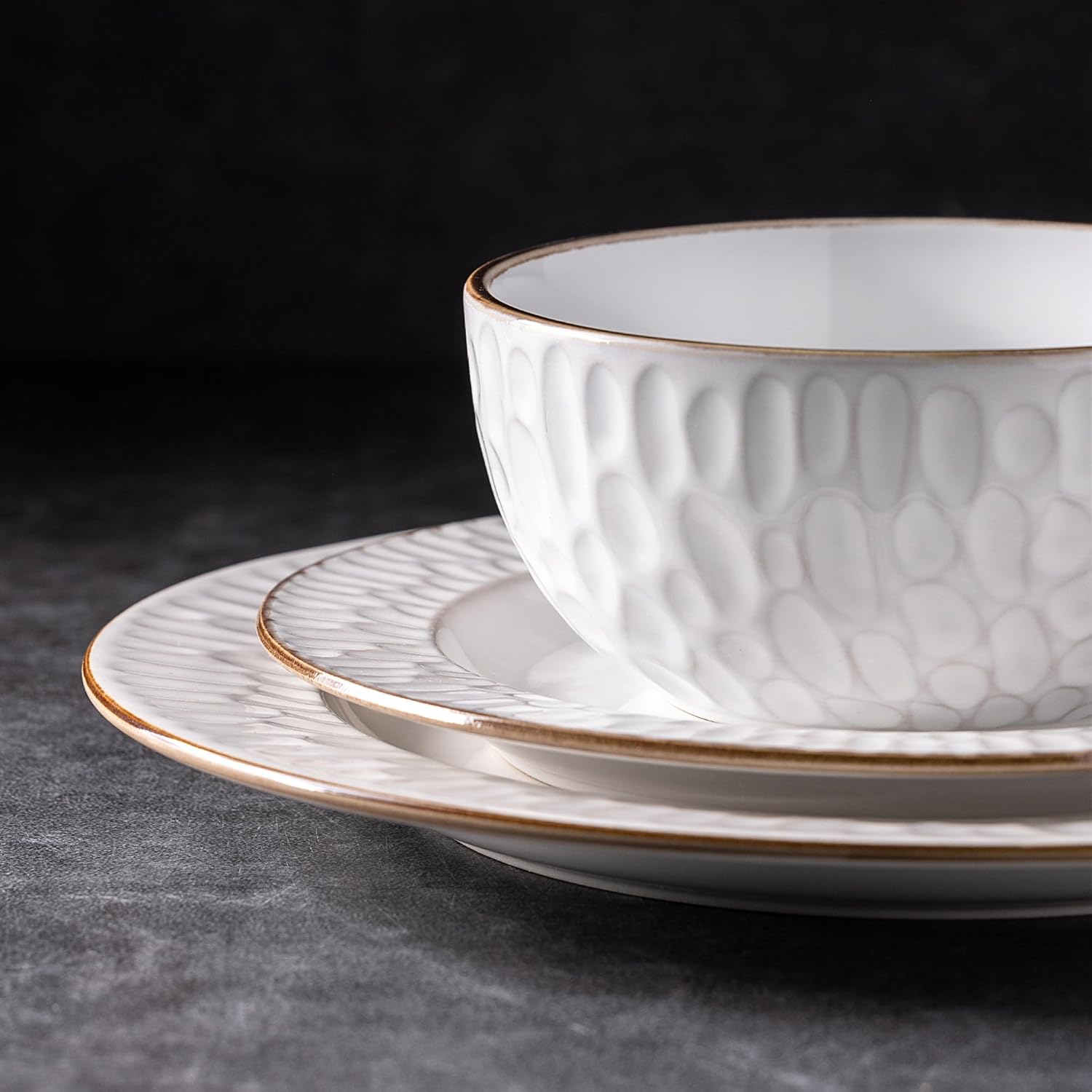 - UNIQUE MODERN DESIGN: Our 24-piece ceramic dinnerware set features a modern and elegant embossment design, allowing your dinner plate and bowl to be the star of the table. The glaze is pure snow-white with light embossment, and darkened rims, which look ultra classy and beautiful. This white dinnerware set is durable enough for everyday use for the family, yet sophisticated enough for that important dinner party or special event. Perfect for wedding and housewarming gifts