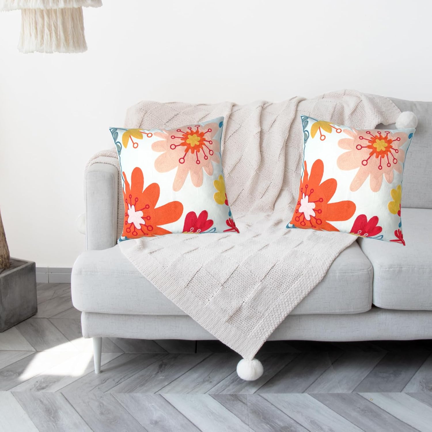 Embroidered Decorative Throw Pillow Cover, 18"x18" Set of 2, Farmhouse Pillowcase Pink Red Flower Knit Pattern Cotton Canvas Cushion Case Square Floral Pillow Case for Sofa Couch Bed Living Room…