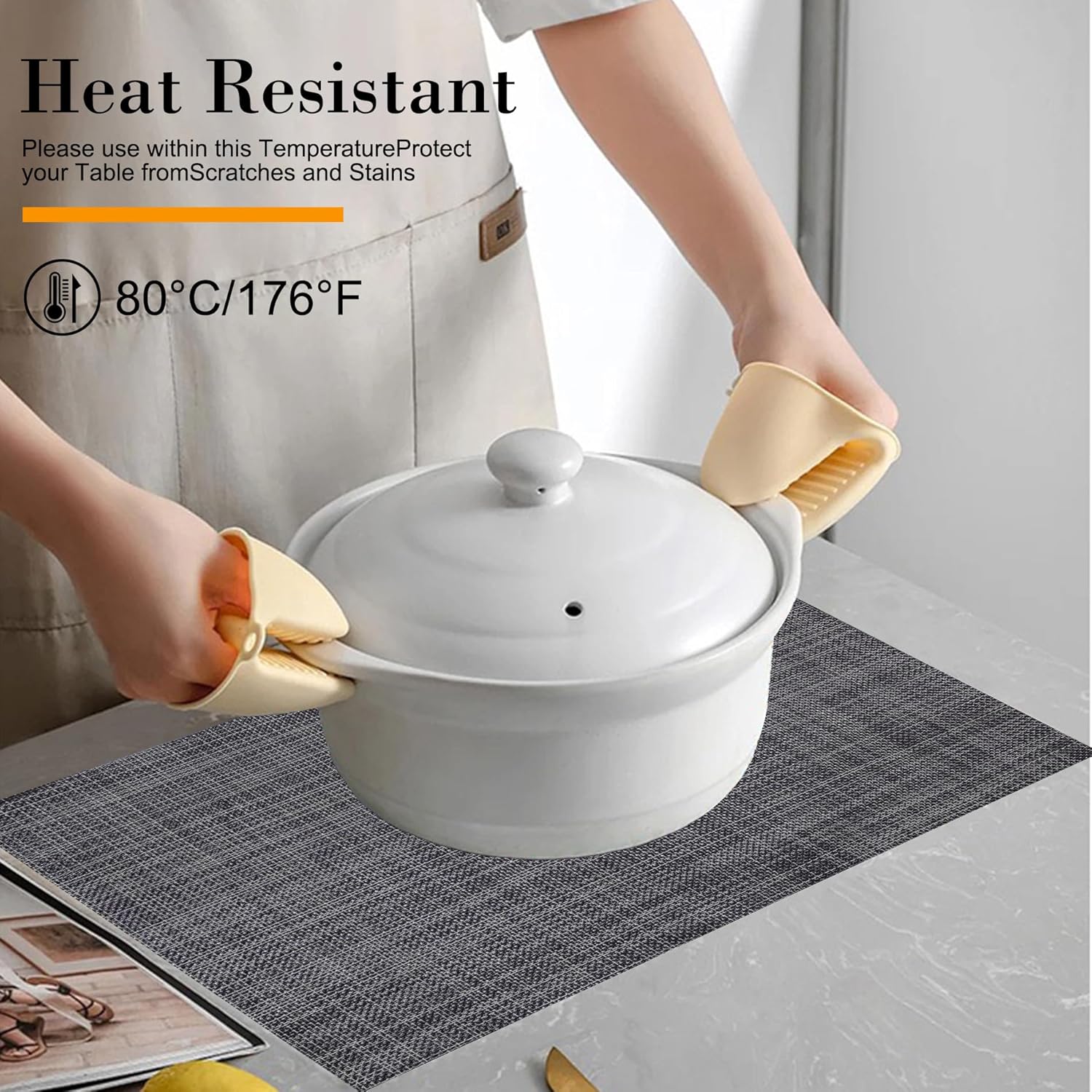 - Protect Your Table:Our placemats protect your table from scratches and spills while adding style. Heat-resistant up to 176°F (80°C), they also keep your food warm. With high-quality woven vinyl construction, they resist stains and water for daily use. Elevate your dining experience with these elegant and durable mats.