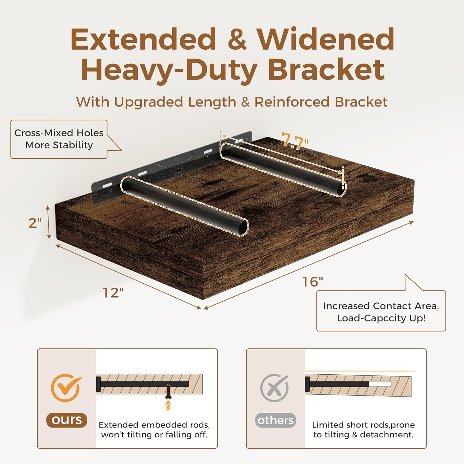 12 Inch Deep Floating Shelves, 16 x 12 Floating Shelf for Books, Rustic Wood Deep Wall Shelves for Home Storage & Display, 2" Thicked Shelves for Kitchen, Living Room, Bedroom, Rustic Brown, 2 Pack