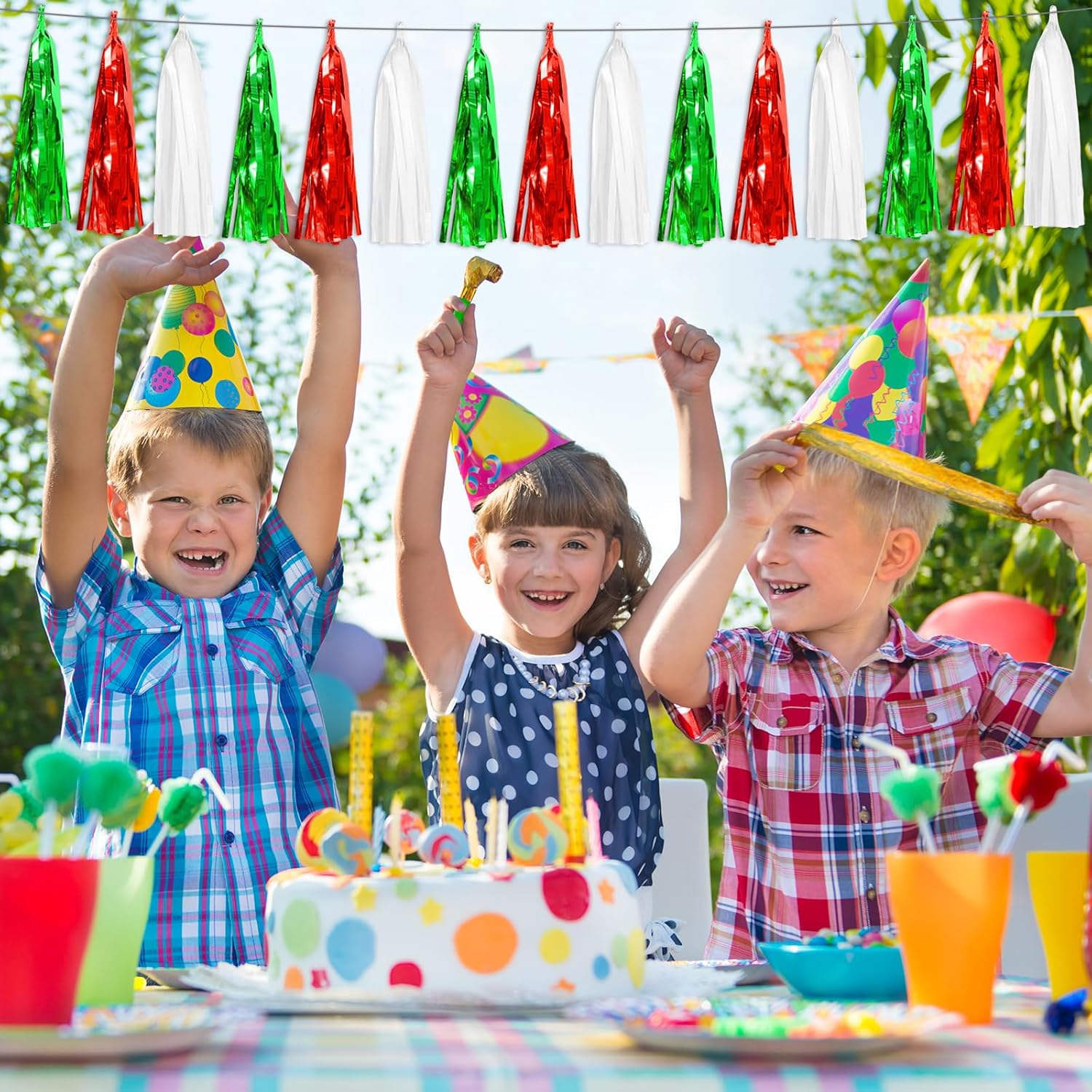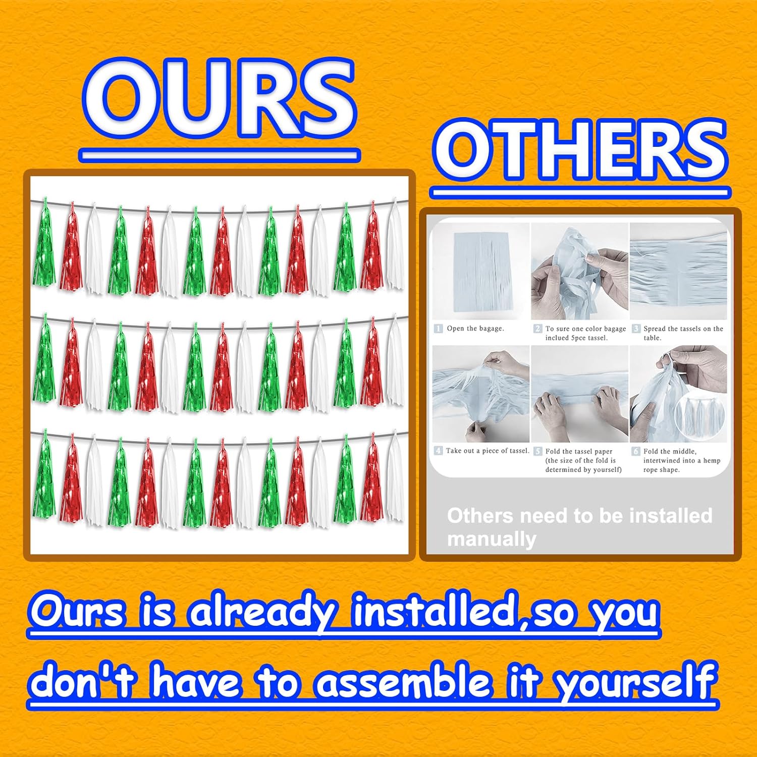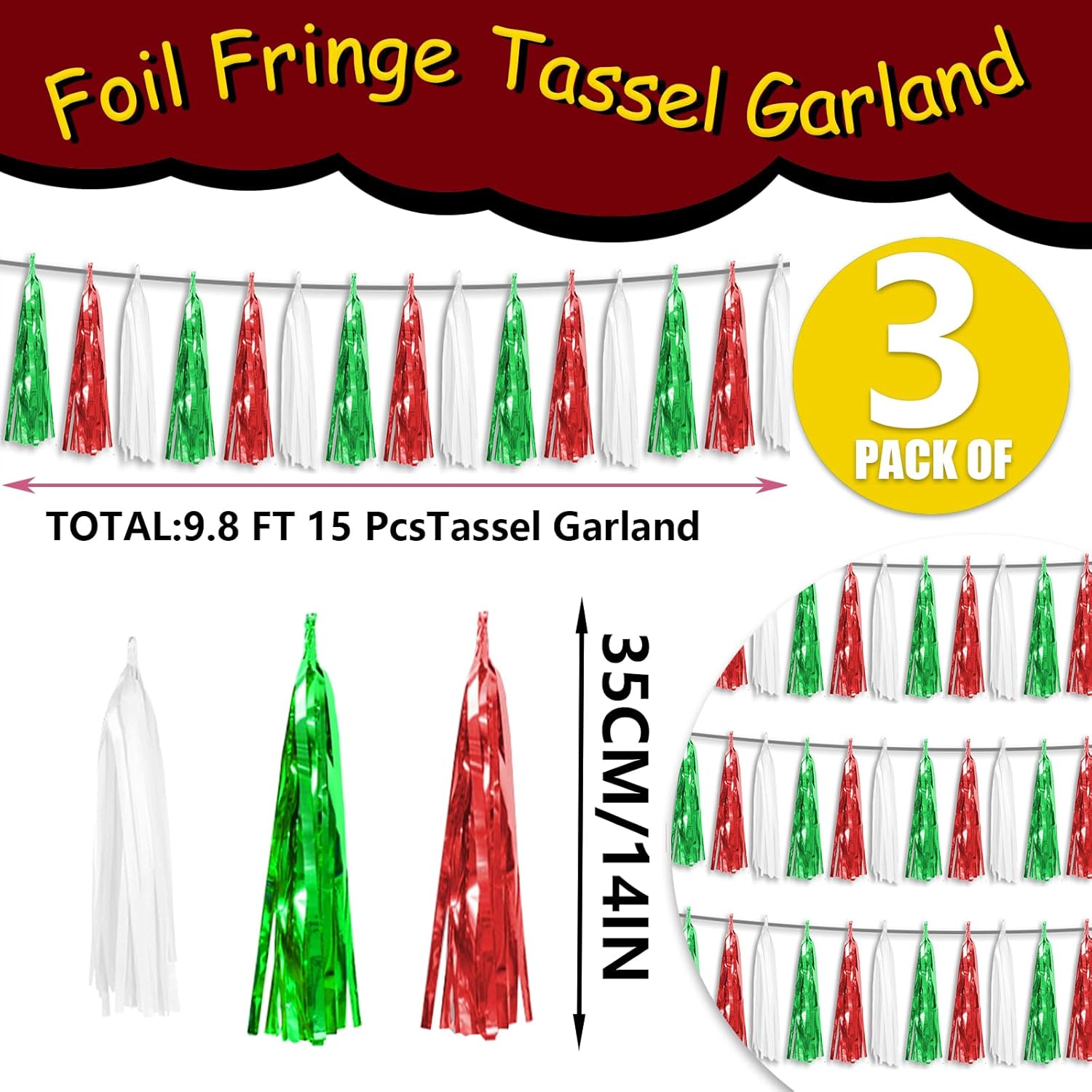 - 【Red Green White Party Supplies Set】: The total length of the Red Green White birthday tassels banner is 29.5 feet, divided into 3 strips, each 9.8 feet long. Each banner contains 15 tassels, and each tassel measures 14 inches, for birthday decorations many occasions, and so on
