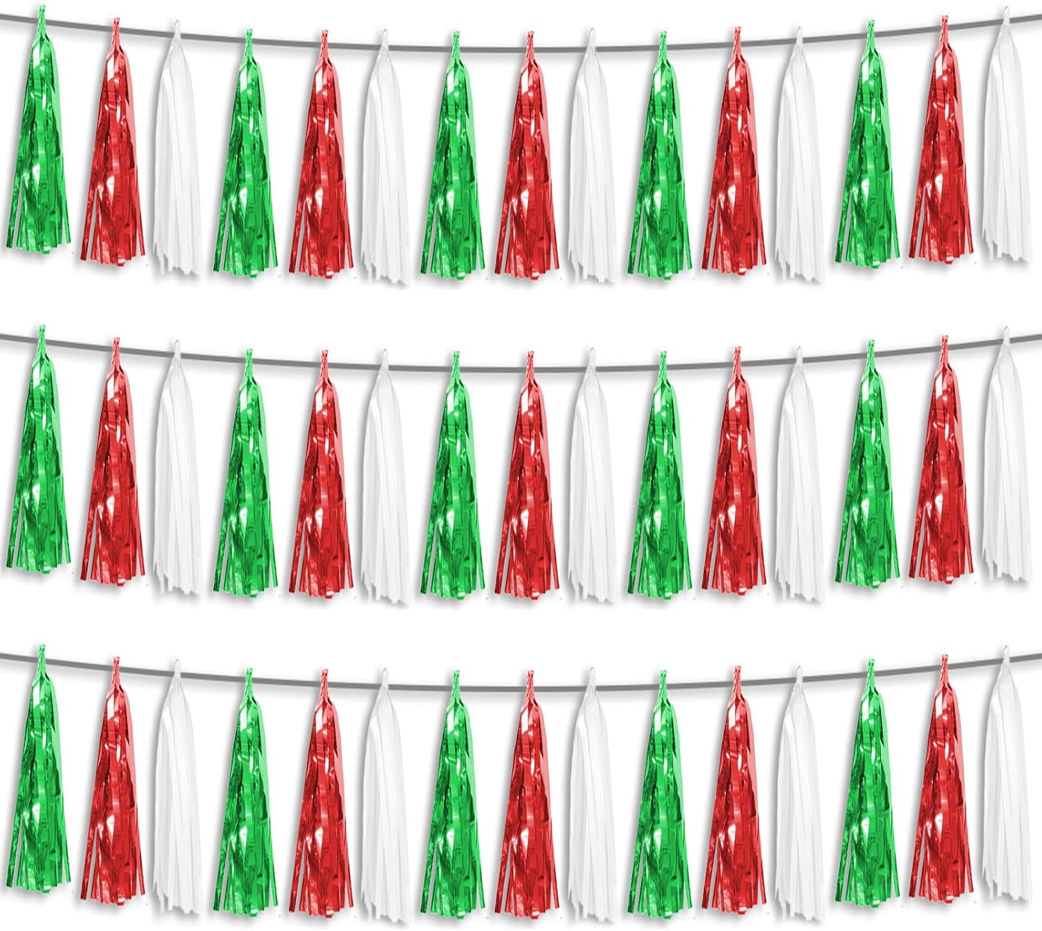 3P Red Green White Foil Fringe Metallic Tassel Streamers Banner Tassel Garland for Parade Floats, Graduation, Wedding, Birthday, Halloween, Christmas, Mexican Italian Birthday Party Decorations