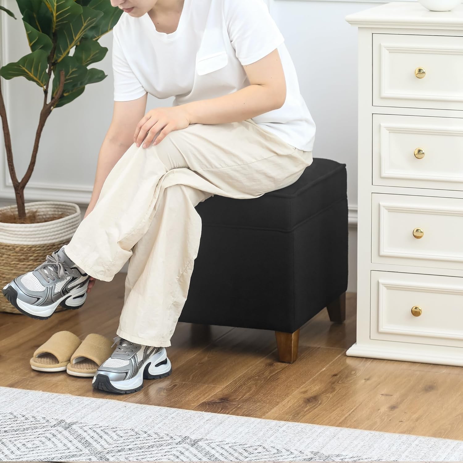 - Morden and Multi-functional Hidden Storage Piece - Featuring with simple balck cotton linen and black legs, ideal for bringing a chic and stylish touch to any room, great fit for your home decor, also works very well as footstool to ease your tired feet, small storage chest and additional seating for your guest.