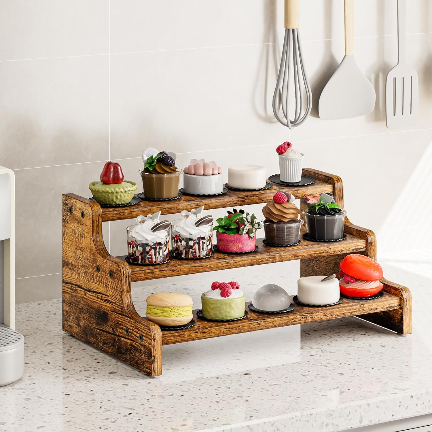 - STYLISH ACCENT: With its rustic brown finish, this step shelf adds a touch of warmth and charm to your kitchen décor.
