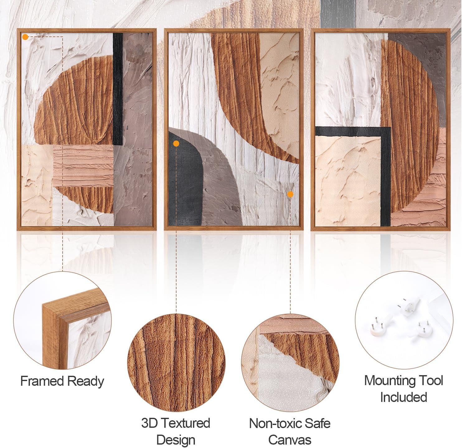 - 3D Textured Design-- The large boho framed canvas artwork is set of 3, each size is about 16"x24" and printed on non-toxic safe canvas. 3D textured UV printing makes it more realistic.