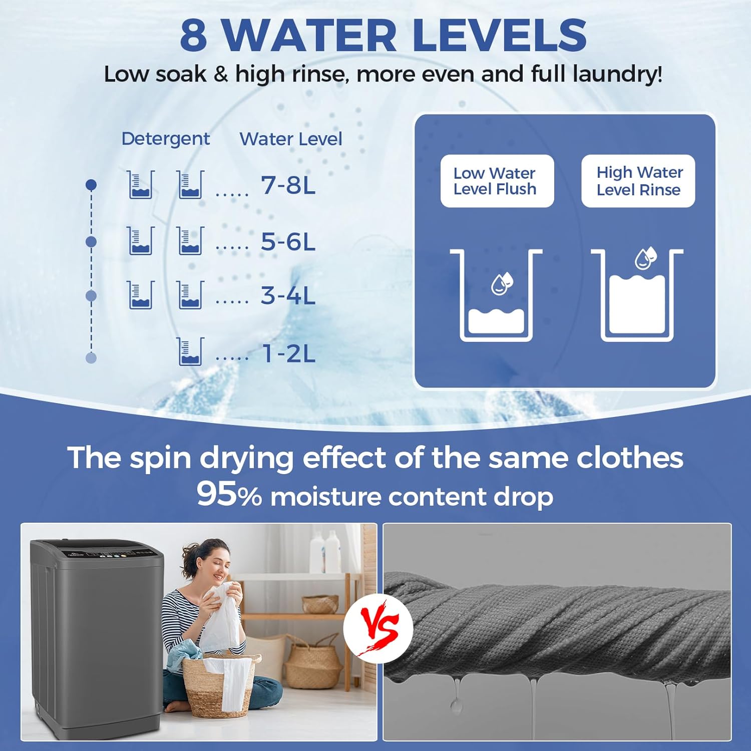 - [Multi-Function]--Designed with fully automatic system, one-button operation makes it simple and labor-saving. Offering 10 washing modes and 8 water levels, catering to various needs from gentle to intensive wash cycles. It comes equipped with 24-hour delay function, tub-clean and child lock function, providing ample flexibility for selecting the optimal wash settings according to the type of fabric and degree of soiling,to satisfy people's need for premium clothes washing and care