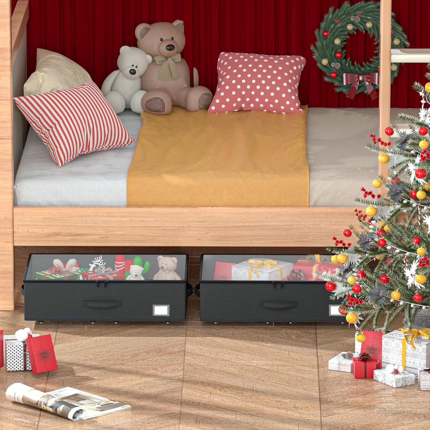 - [Strong Weight-Bearing Capability]: Made of durable oxford fabric, our underbed storage is built to withstand heavy weights. The bottom bracket is reinforced with hard wood, providing superior support compared to other elastic band structures. You can confidently store items weighing up to 40 pounds, such as books, However, when placing heavy objects above, please be careful to move slowly to prevent the wheels from being damaged by excessive lateral force!