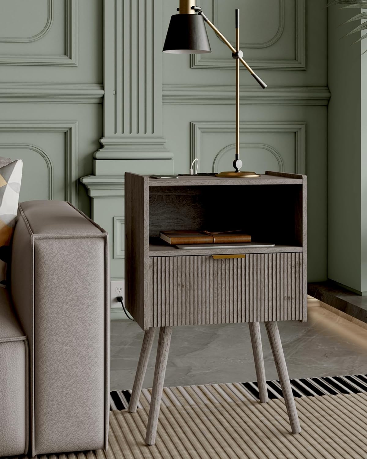 Nightstand,Modern Bedside Table with Storage Drawer and Open Wood Shelf, Accent Night Stand with Solid Wood Legs for Living Room, Bedroom and Small Spaces,Easy Assembly (Grey Oak-Outlet)