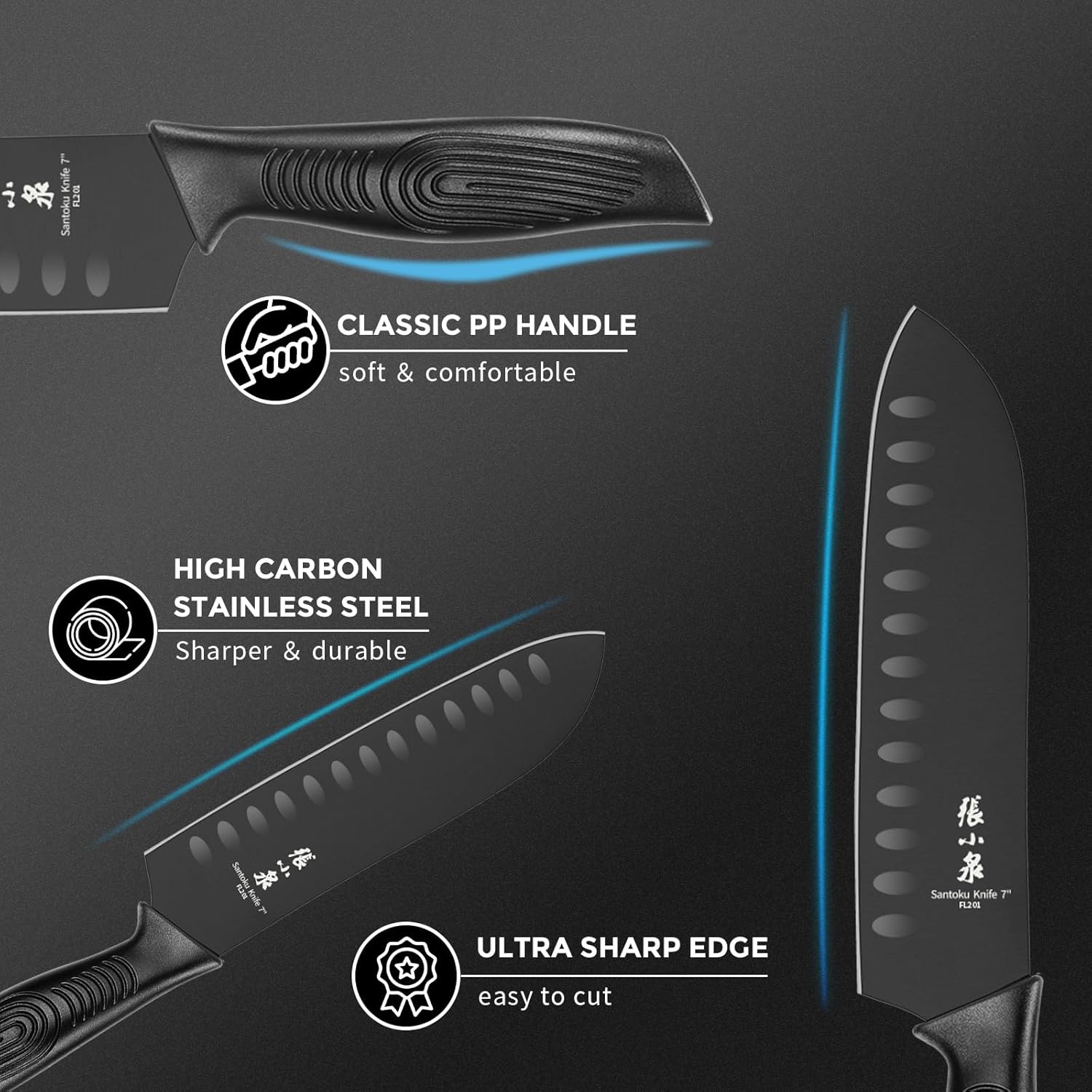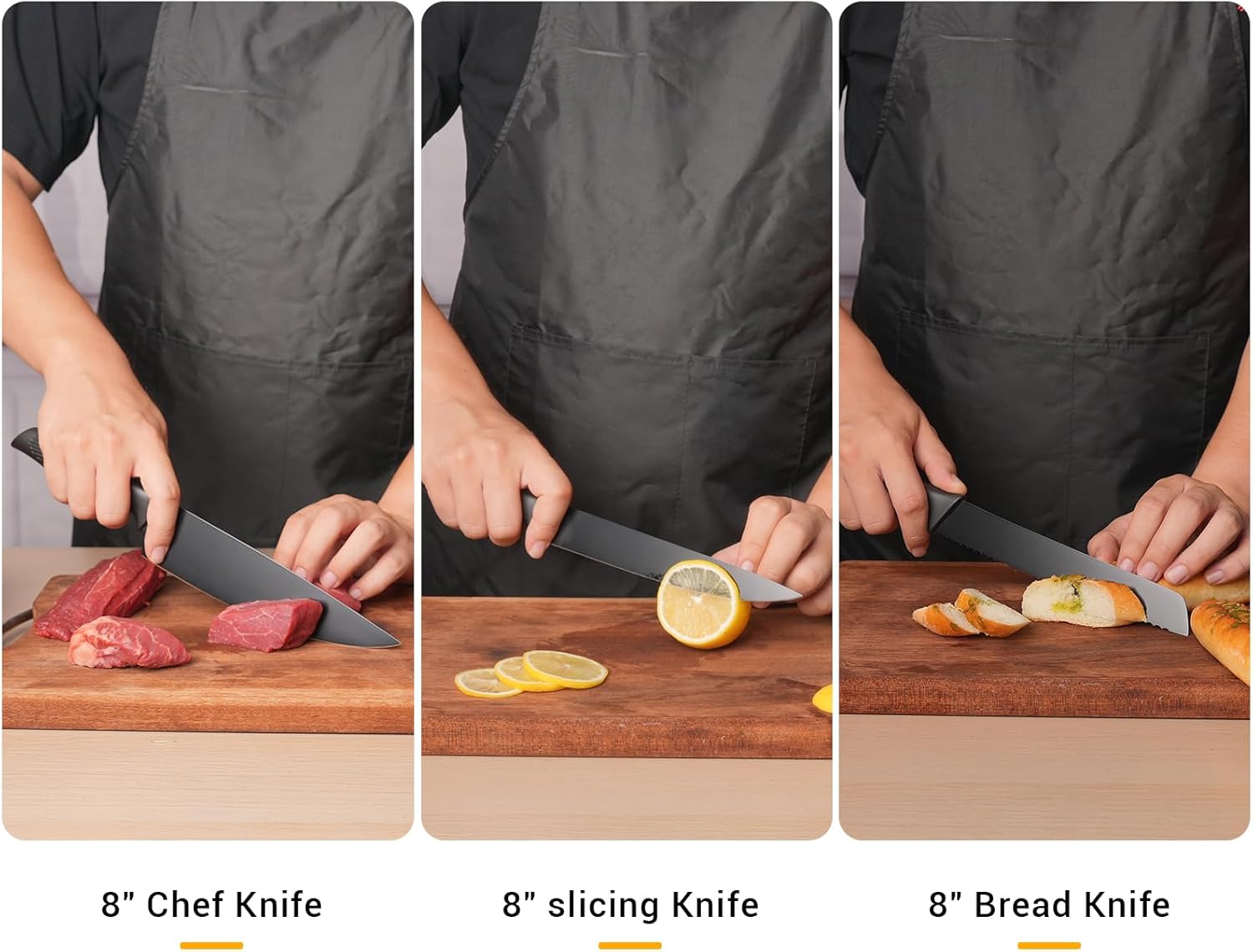 - 【OUSTANDING PERFORMANCE】: This knife block set uses high carbon stainless steel which is very sharper and durable, the stainless steel surface is black coating, which is more rust-resistant and beautiful than ordinary styles.It can be used at high frequency or after long periods of inactivity.