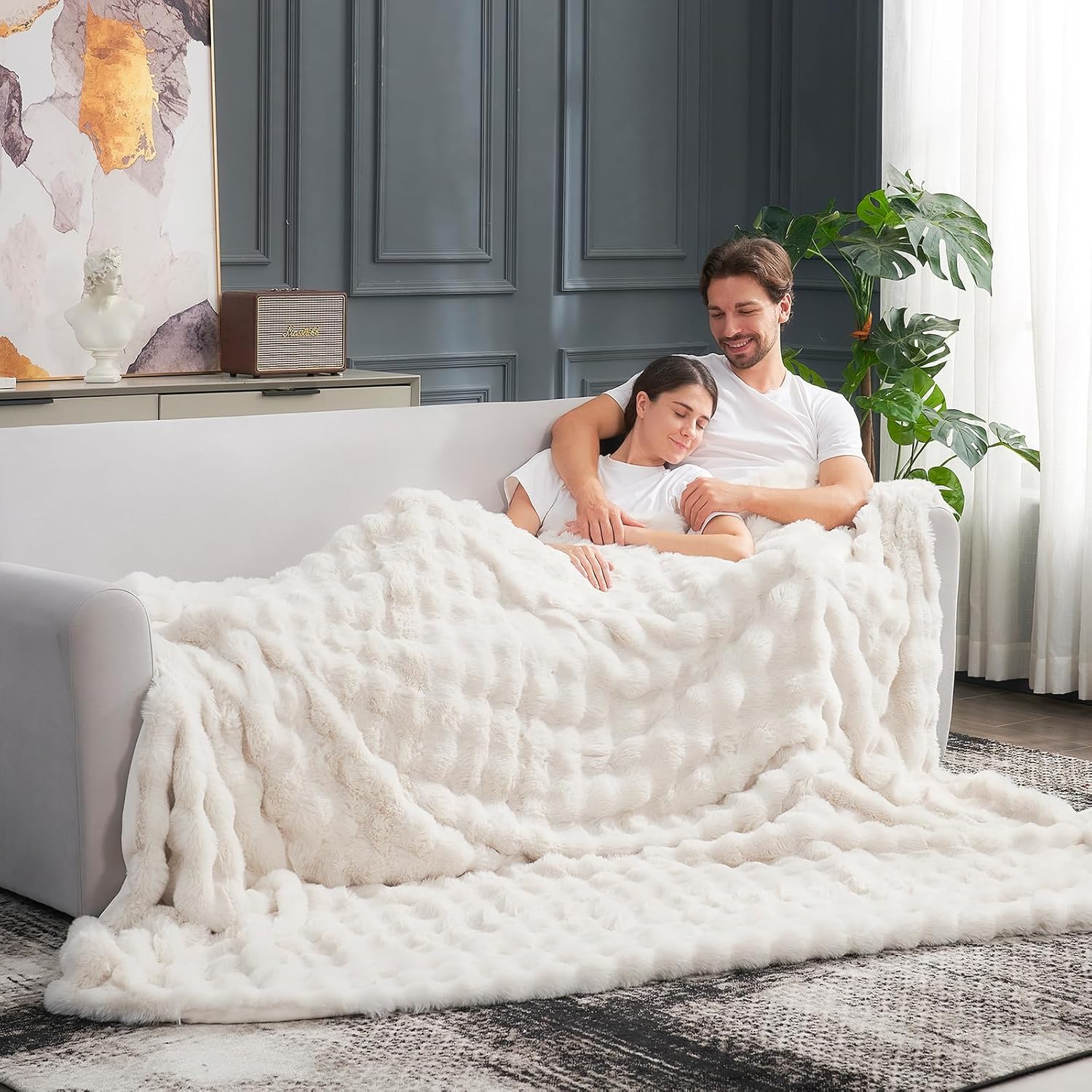 Cozy Bliss Faux Fur Throw Blanket for Couch, Fuzzy Soft Plush Thick Bubble Blanket for Sofa Bedroom Living Room, 90 * 90 Inches Cream White