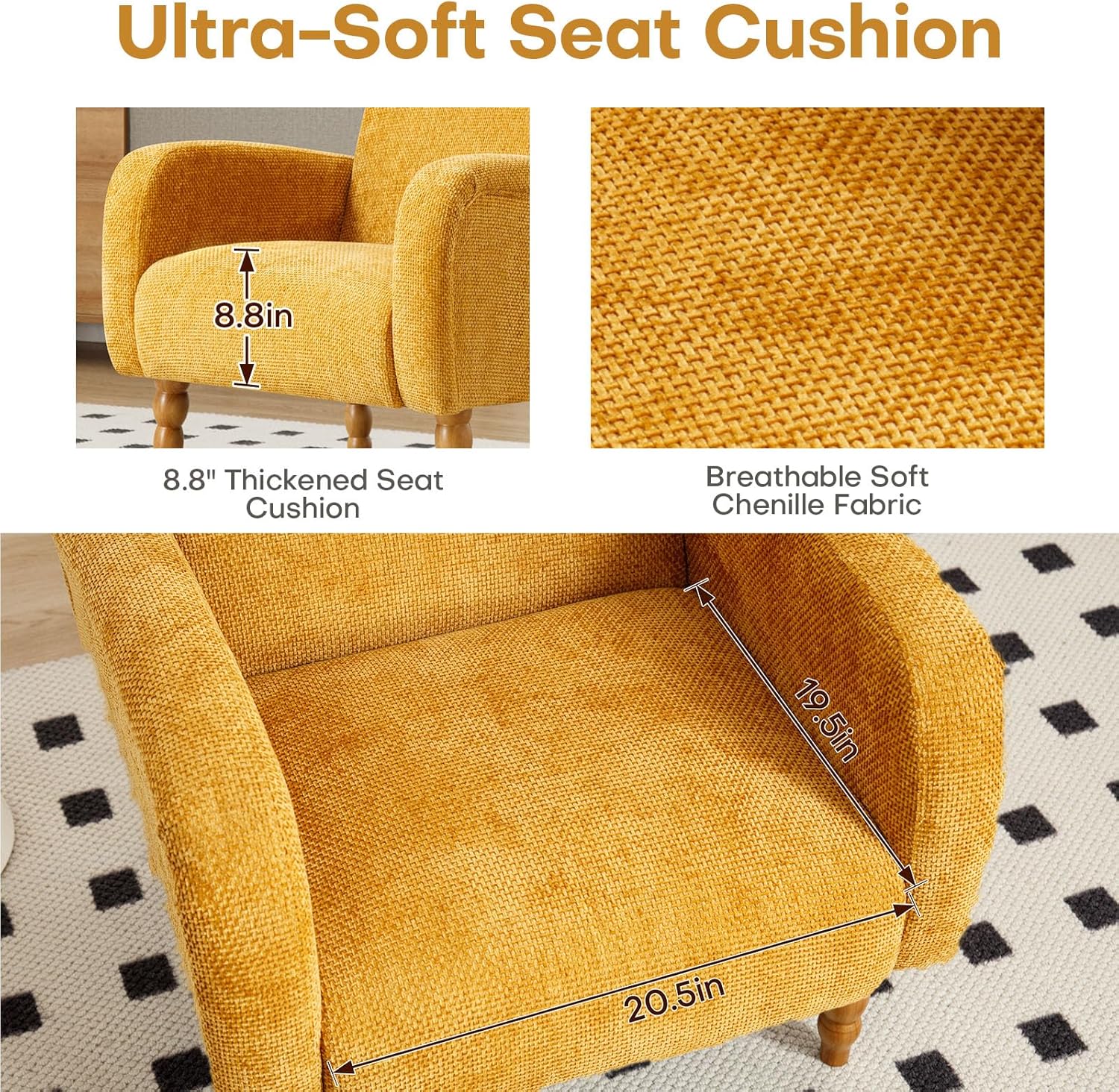 Chenille Fabric Accent Chairs Set of 2, Upholstered Armchair with Solid Wood Legs, Modern Living Room Accent Chair, Comfy Single Sofa Reading Club Chair for Bedroom Reception Lounge, Yellow