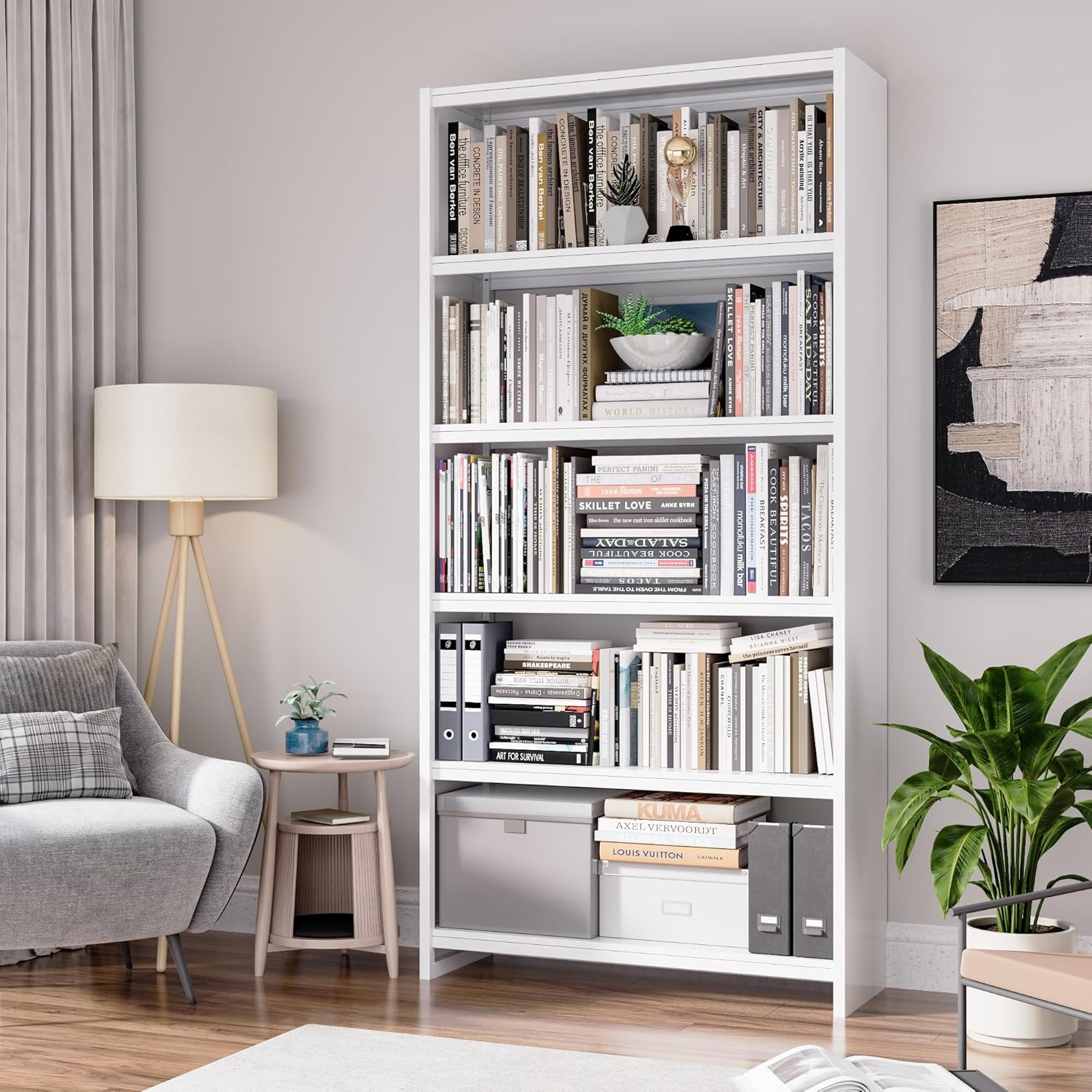 69" Tall Bookcase, 5-Tier Wide Bookshelf, Library Book Case with Display Shelf, Lightweight Metal Bookshelves, Industrial Book Shelf for Home, Office, Library, and School (White)