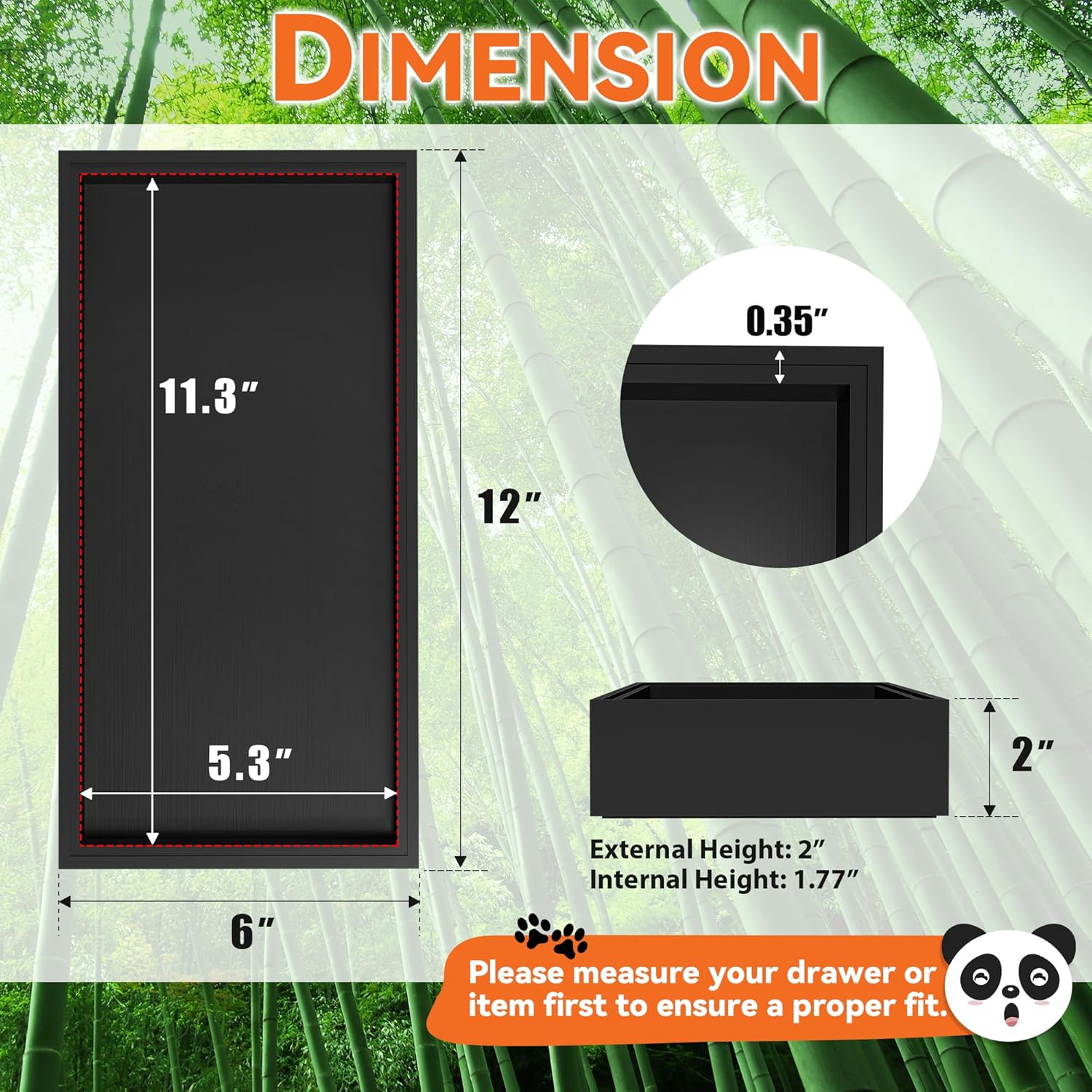 - Each bamboo drawer organizer measures: external size: 12" L x 6" W x 2" H; internal size: 11.3" L x 5.3" W x 1.77" H. Please check the size before purchasing