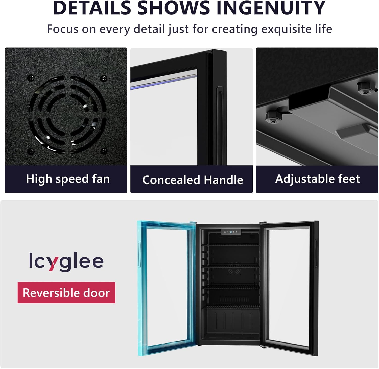 - 【Smart Temperature Control】Our drink cooler offers adjustable temperature control from 34°F to 64°F. The smart touch panel make a convenient monitor and a precise adjustments. ICYGLEE drink refrigerator provides you with frost free air cooling technology for your beverage enjoyment