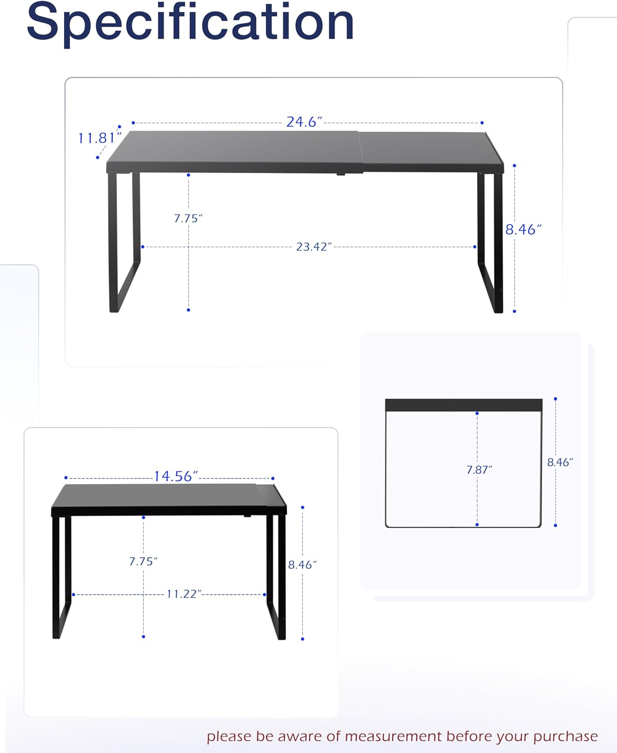 - SPECIFICATION: 11.8’’D * 14.56-24.6’’W * 8.46’’H. If you purchase 2 of these expandable shelves set you can stack one of top of another thereby creating a two-tier storage space. Easy to assemble with a clear manual.