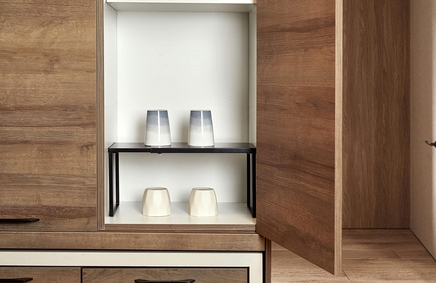 - FUNCTIONAL STORAGE: This cabinet shelf can be used in various scenes of your home including cabinets, pantry, cupboards, kitchens, studio, bathrooms, bedrooms, under sink and any counter surfaces. You may use the shelf as a storage organizer for plates, cups, dishes, pots, bowls, snacks, books, magazines and whatsoever.