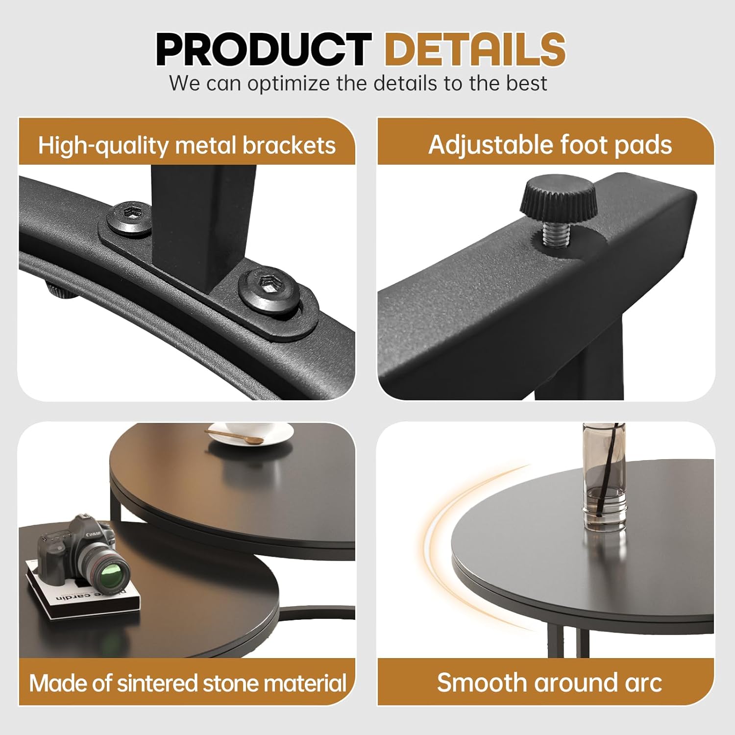 - [Sturdy and Durable] Nesting coffee table set of 2 for living room, includes a larger table and a smaller round coffee table, small nesting table: 16"(D) x 16"(H), large nesting table. 24"(D) x 18"(H). Our durable and stable nesting coffee table consists of a sintered stone table top and sturdy metal legs.