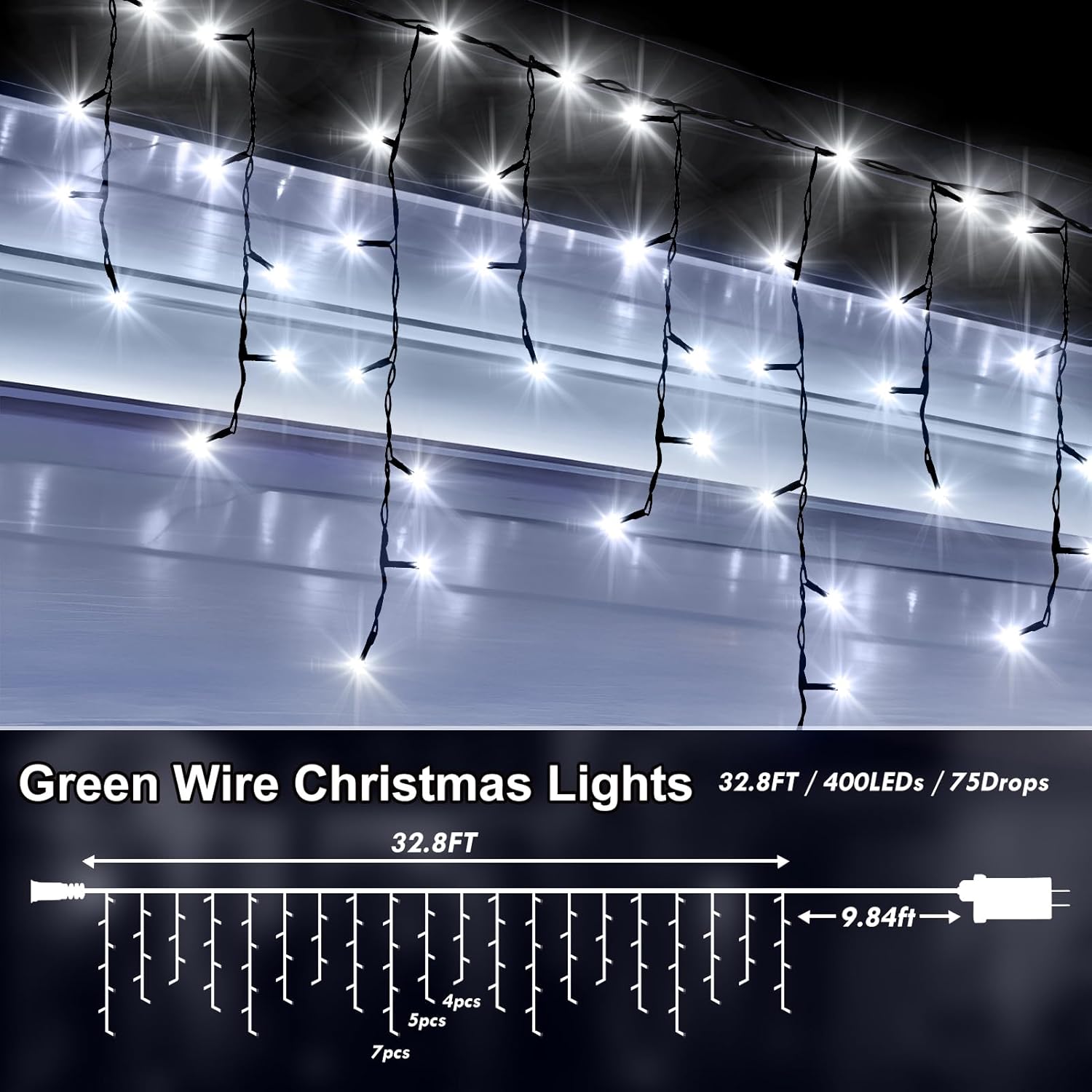 KNONEW 33FT 400 LED Christmas Lights Outdoor Black Wire String Lights with 75 Drops, 8 Lighting Modes, Timer Memory Function Connectable Hanging Curtain Lights for Halloween Party Decor (Cool White)