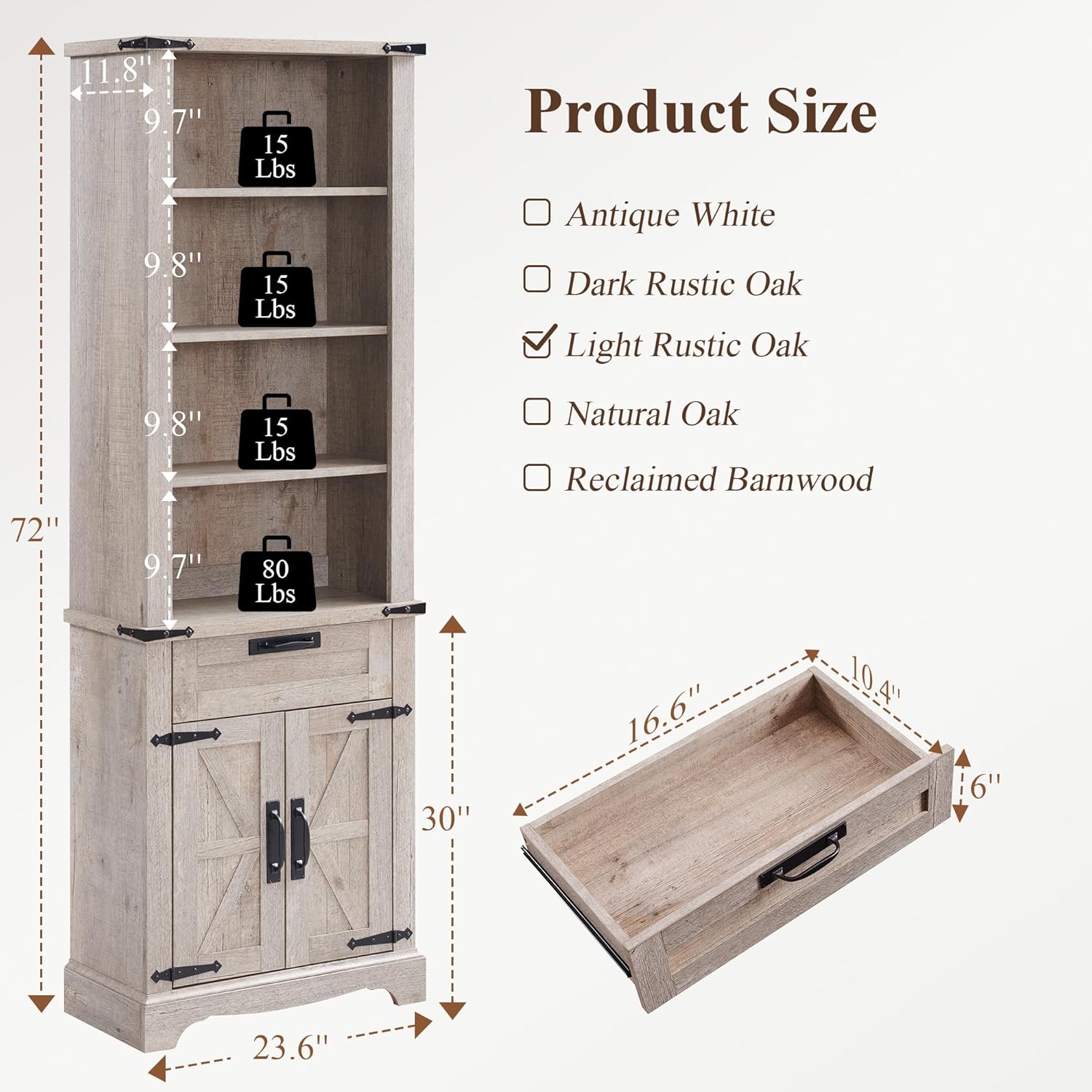 RedLemon Bookshelf with Storage Cabinet, 72" Tall Farmhouse Bookcase with Adjustable Shelves and Barn Door, 4 Tier Office Wood Bookshelf with Drawer for Office Library Living Room (Light Rustic Oak)