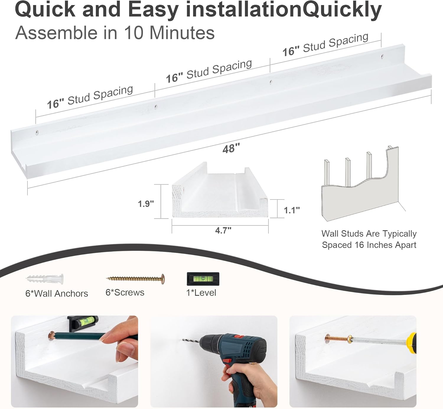 Floating Picture Ledge Shelves 48 Inch Solid Oak Wood Set of 2, Rustic Wall Storage Shelves with Lip, Kids Bookshelf, Photo & Picture Ledge Shelves for Bedroom, Living Room, Kitchen