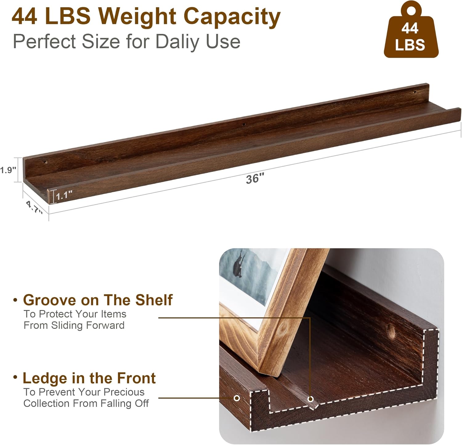 Floating Picture Ledge Shelves 36 Inch Solid Oak Wood Set of 2, Rustic Wall Storage Shelves with Lip, Kids Bookshelf, Photo & Picture Ledge Shelves for Bedroom, Living Room, Kitchen