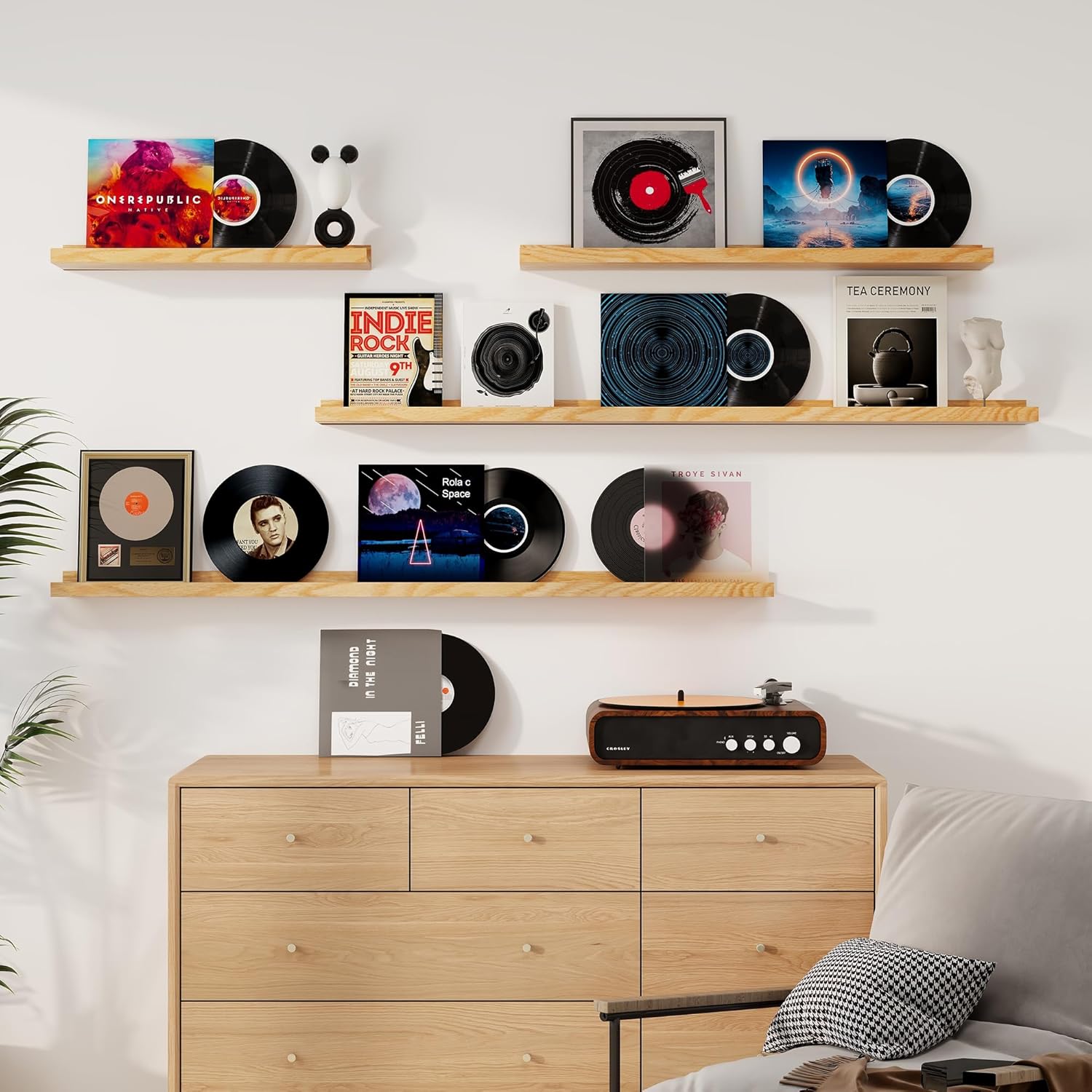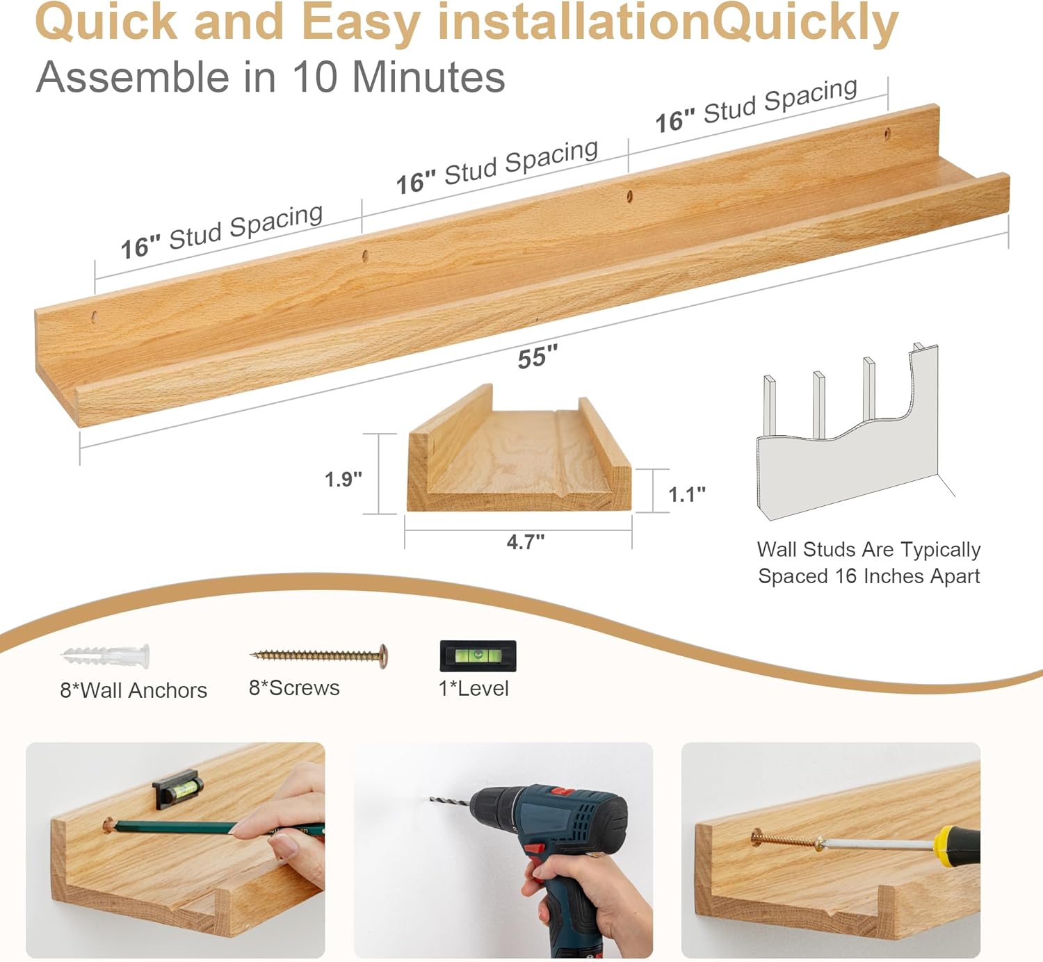 - Picture Ledge Design: Ideal for displaying photos, artwork, small plants, or collectibles, these shelves feature a thoughtful ledge design with a subtle lip and a shallow groove behind it. This design securely holds items in place while maintaining a clean, modern look.