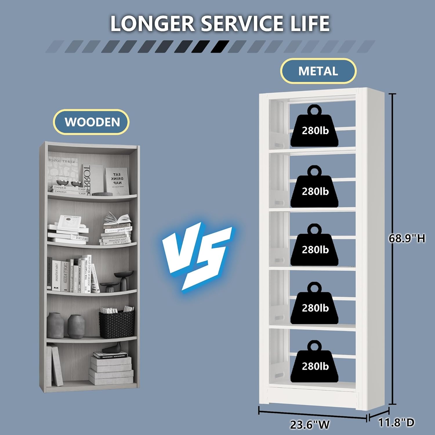 - 【Metal Bookshelf】Wide metal bookcase is more modern than wooden cabinets, easier to install, greater load-bearing capacity, and free from formaldehyde and odors. 5-tier large book shelf is made of cold-rolled steel., adjustable shelf can holds 280 pounds. Big bookshelf adopts thickened columns, ensure load-bearing capacity while keep stability. Tall bookcase is rustproof and easy to clean. Modular Bookshelf with modular expansion capability can accommodate more collectibles.