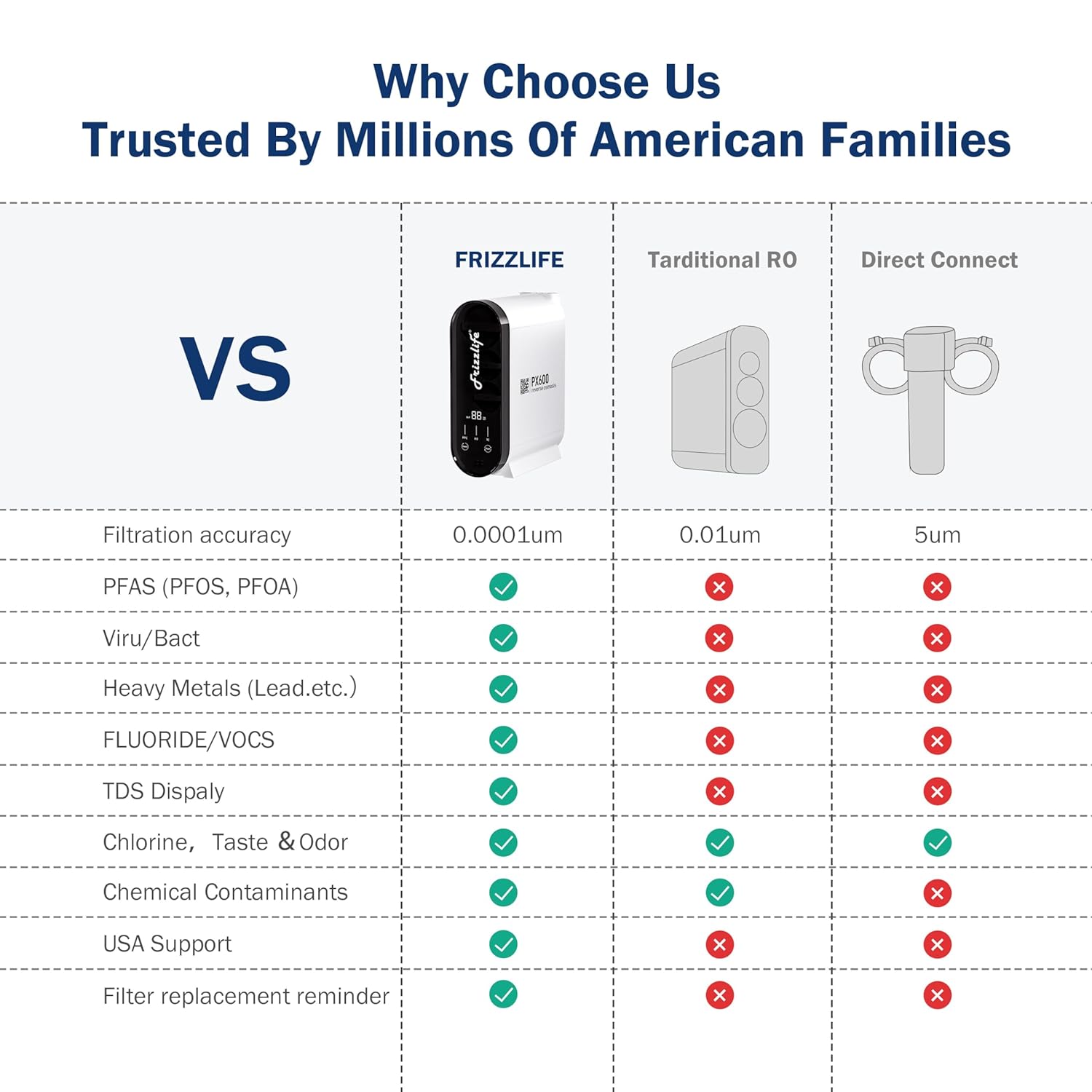 - [11-Stage Filtration & Superior filtration performance] Frizzlife PX600 reverse osmosis water filter system adopts 8-layers filtration with 0.0001 micron precision. Effective get rid of 1000+ harmful contaminants(99.99%), including Chlorine, Fluoride, Lead, Heavy Metals, Arsenic, Chloramine, TDS, PFAS, PFOA, PFOS, and more.