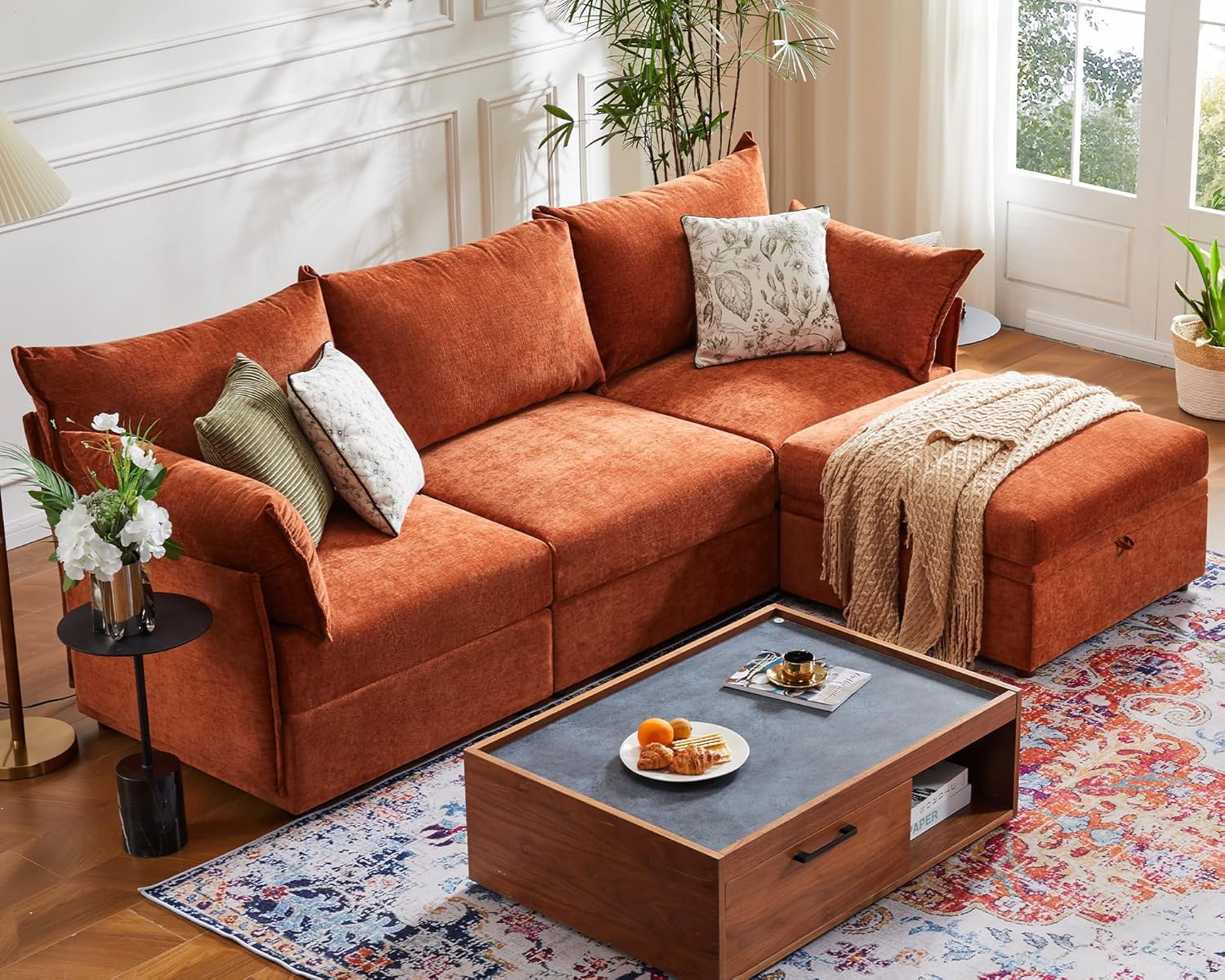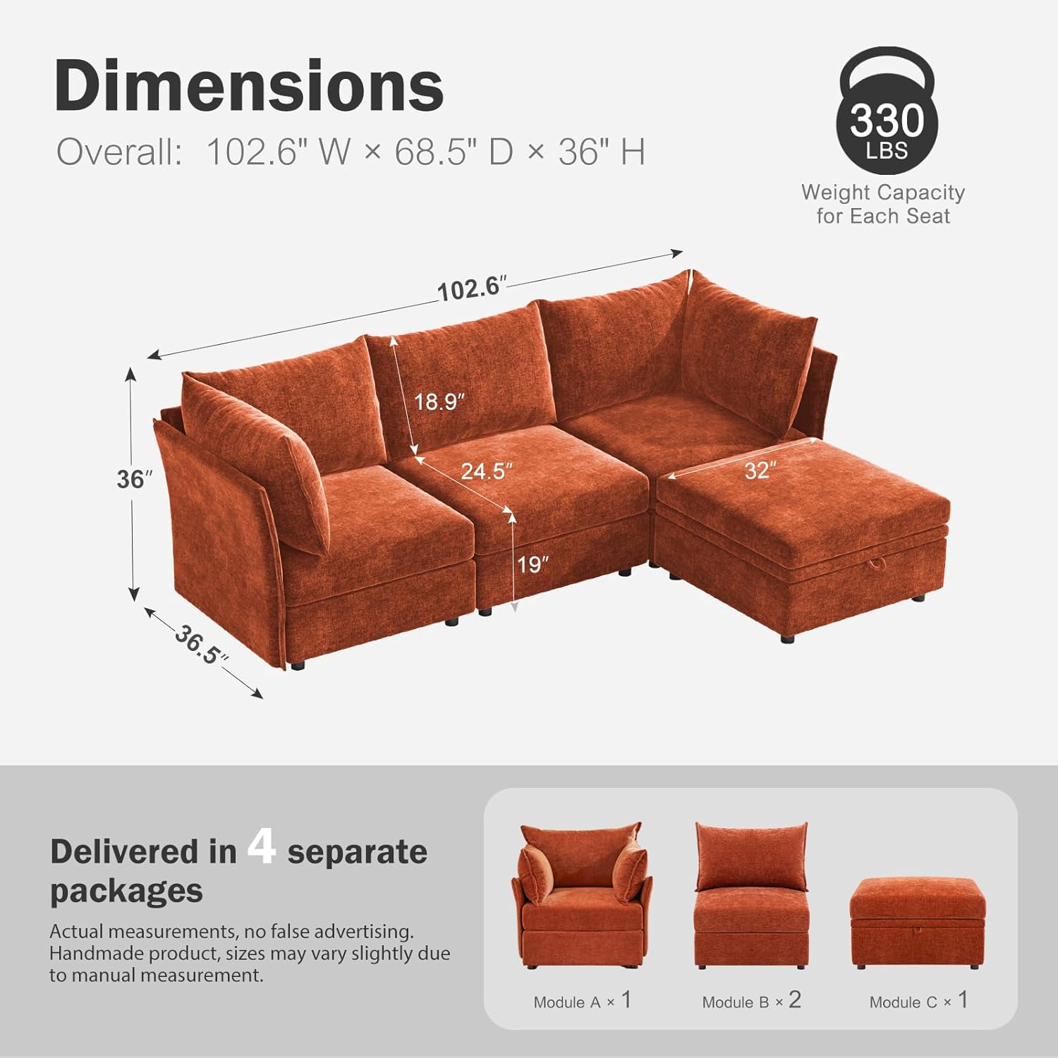 102.6" Modular Sectional Sofa, L Shaped Couch Set for Living Room, 3-Seater Comfy Cloud Couches with Movable Storage Ottoman,DIY Combination - Chenille Terracotta Orange